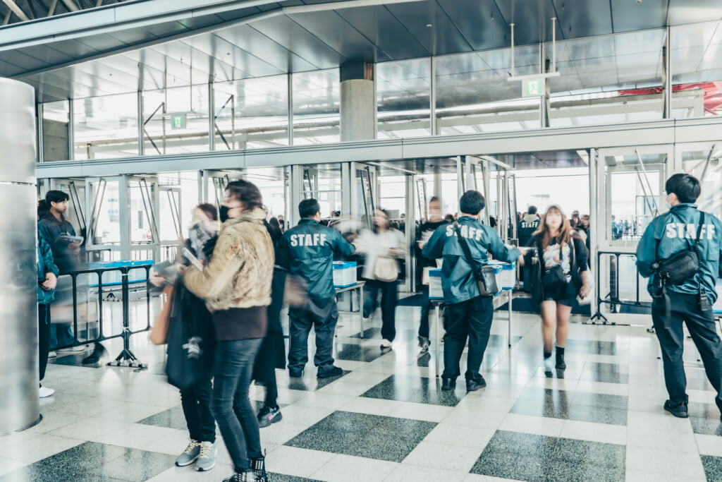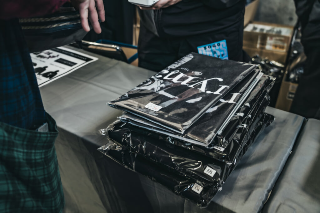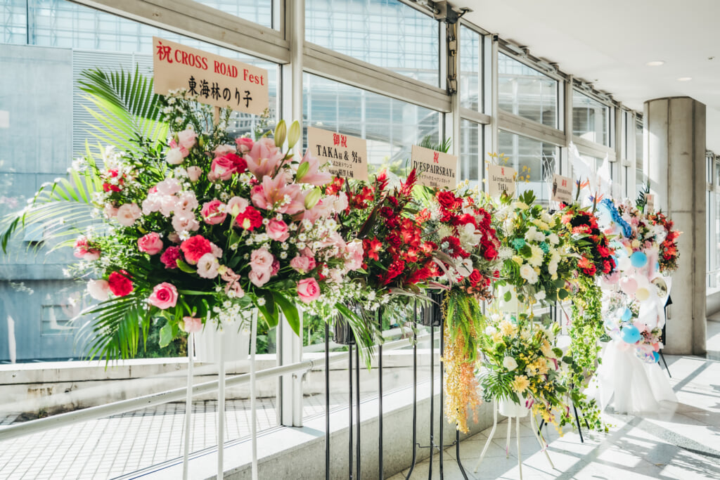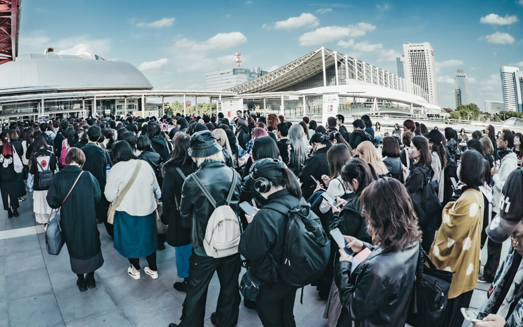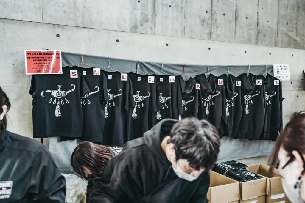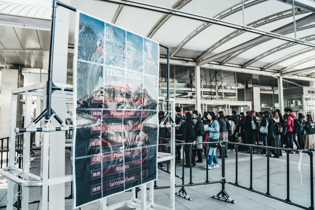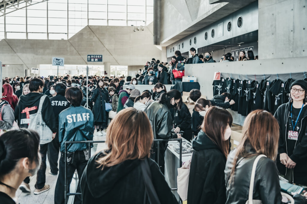 晴天の空のもと、正午12時の開場時間を前に、幕張イベントホール入口付近には長蛇の列がどこまでも伸びて、<CROSS ROAD Fest>の期待度の高さを感じさせる。開場後は、あっという間に物販ブースが活気に溢れた。