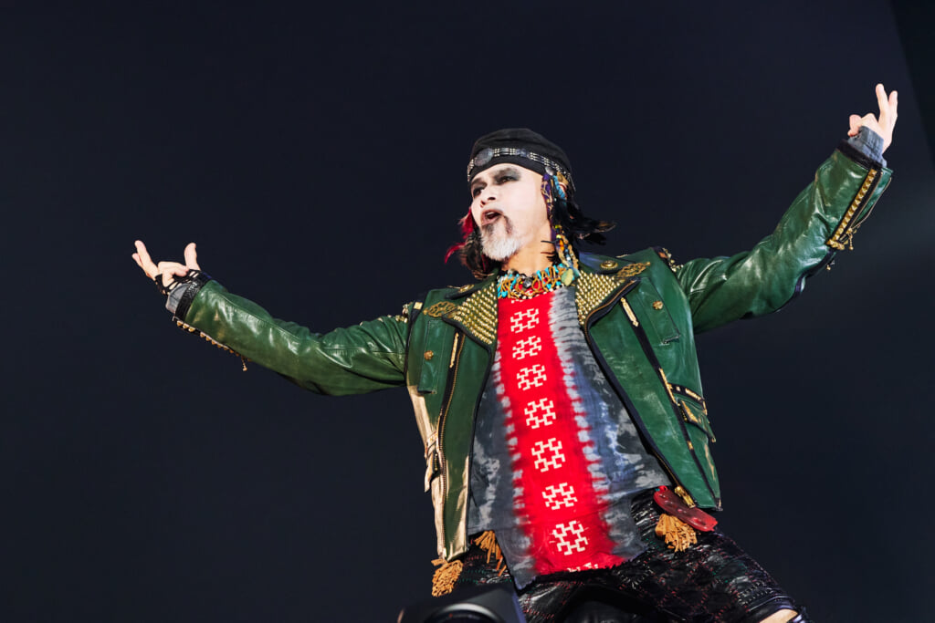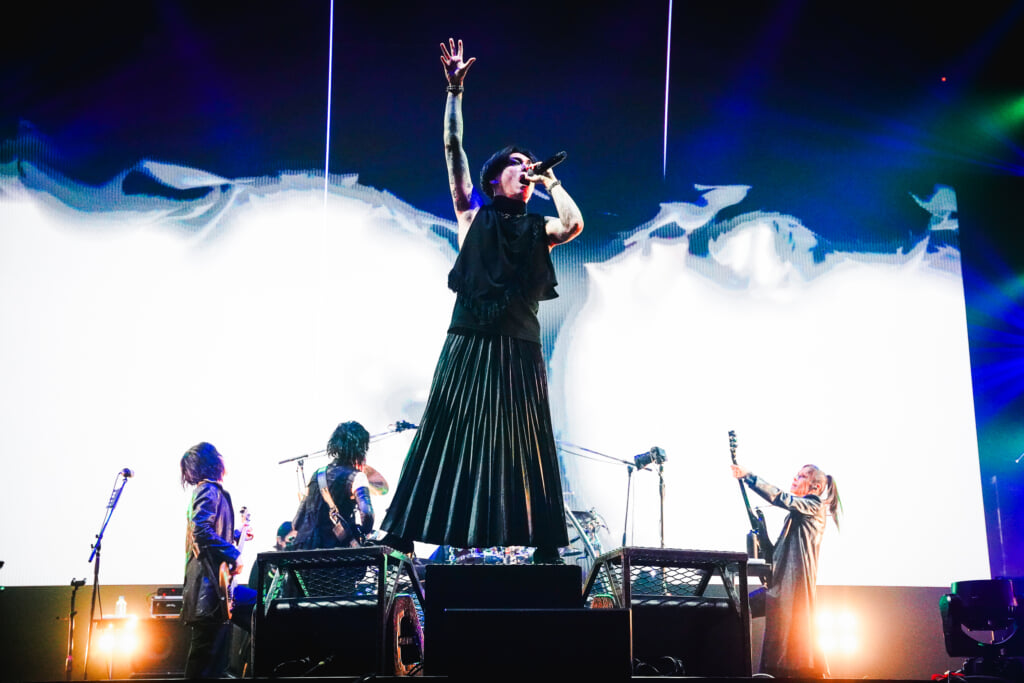 そんな中、「空谷の跫音」ではSUGIZOがヴァイオリンでゲスト参加し、2015年の<LUNATIC FEST.>でのコラボが再現されるシーンも。壮大なメロディにSUGIZOの凛とした音色が寄り添い、10年前よりも密度の濃い共演に惹き込まれた。後半は、悲痛な慟哭と激しい狂騒が入り交じるドラマチックな「VINUSHKA」から、感情を掻き立てる「THE FINAL」など、DIR EN GREYのライヴでハイライトを担ってきた名曲を連打。我が道を突き進むスタンスを改めて示した。