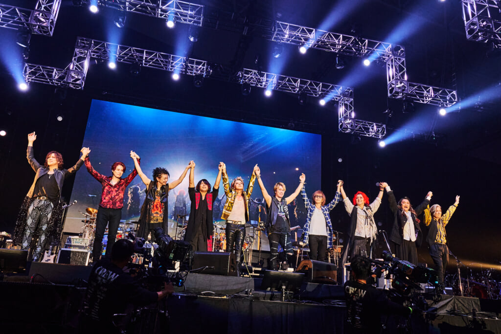 ドラムの横に座った真矢が見守る中、歓喜のセッションの曲目に選ばれたのは「STORM」だ。RYUICHIに加え、BAKI、MORRIE、西川貴教らが歌い繋ぎ、楽器陣もそれぞれ絡みながら演奏。どこを見ても今夜限りの貴重な共演ばかりでまったく目が足りない。とにかく会場もステージ上もピースフルな空気に包まれ、1日目のフィナーレを迎えた。