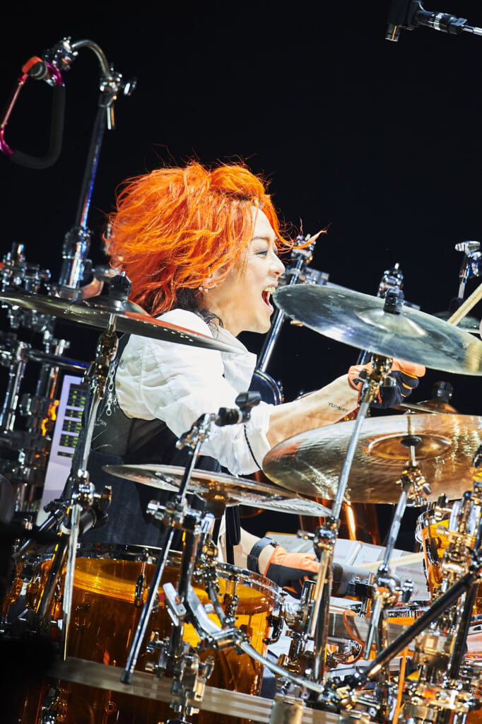 特にRYUICHIの歌声は、自ら<覚悟の夜>と名付けた東京ドームを乗り越え、完全に次のステップへと進んでいた。過去曲をフィーチャーしたツアーでは披露されていなかった「宇宙の詩 〜Higher and Higher〜」を 圧倒的に歌い切り、さらに浮遊感溢れる「inside you」での表情豊かな歌唱は圧巻。「inside you」は真矢が原曲を手掛けていることもあり、RYUICHIの歌を軸に4人が想いを音に重ね合い、愛に満ちたグルーヴが生まれていた。「全バンド集めても超えられる球を投げたいね」とRYUICHIが語ったのも納得だ。