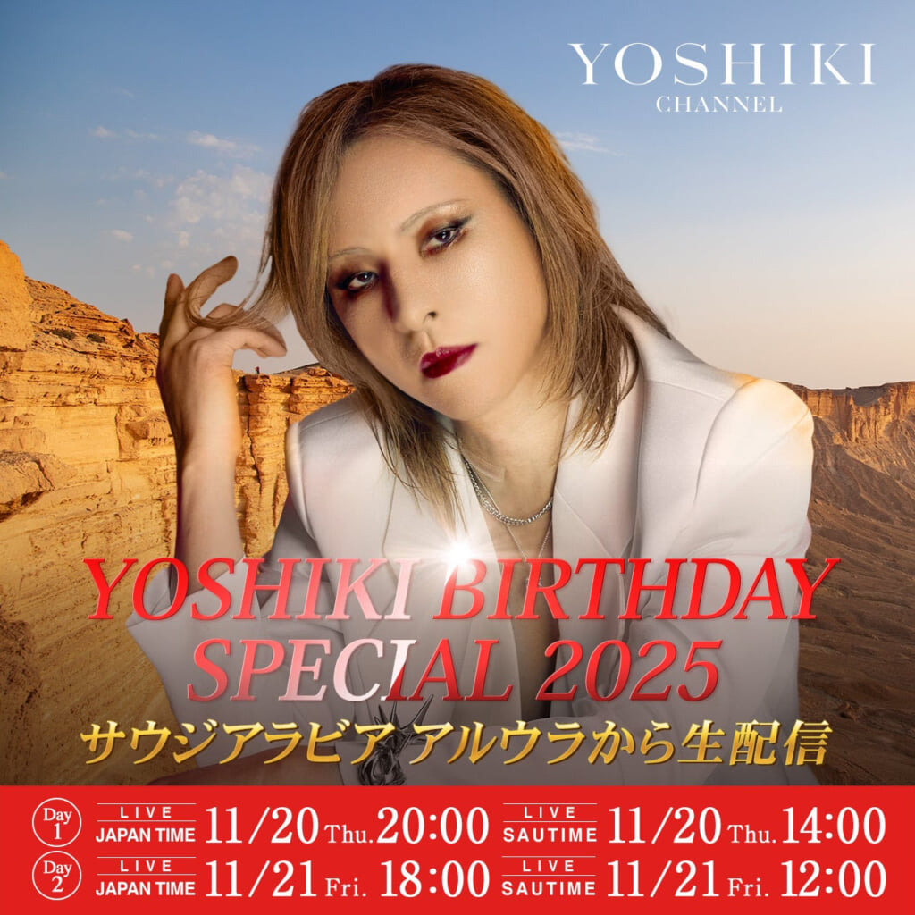 YOSHIKIは、サウジアラビア・アルウラに位置するユネスコ世界遺産「Hegra(ヘグラ)」で開催される<Hegra Candlelit Classics>に出演し、現地時間11月20日(自身の誕生日)にコンサートを行なう。これに伴い、公演の前後に現地アルウラから生出演する特別番組『YOSHIKI BIRTHDAY SPECIAL 2025』の配信が決定した。