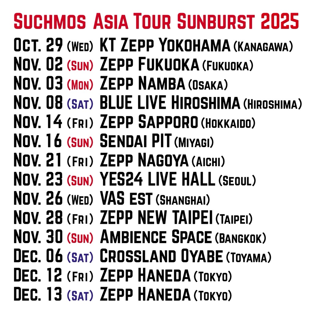 現在、Suchmosは<Suchmos Asia Tour Sunburst 2025>を開催中。 11月23日(日)のソウル公演を皮切りに、上海、台北、バンコクのアジア主要都市、そして富山を巡り、12月13日(土)のZepp 羽田公演にてツアーファイナルを迎える。