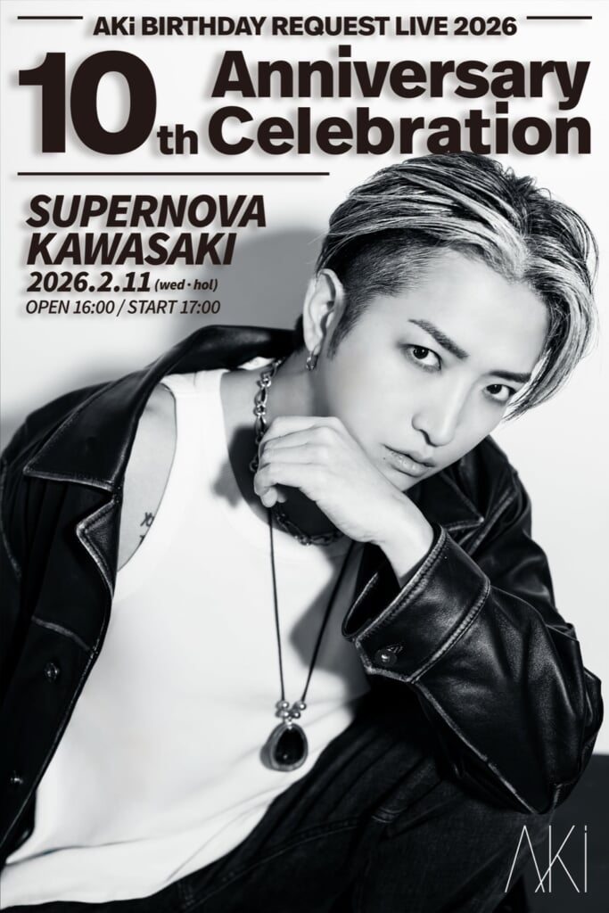 シドの明希によるソロプロジェクトAKiが2026年2月11日(水・祝) SUPERNOVA KAWASAKIにて自身の誕生日と活動10周年を記念したワンマンライブ<AKi BIRTHDAY REQUEST LIVE 2026「10th Anniversary Celebration」>を開催することを発表した。