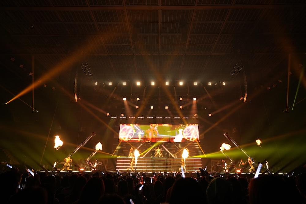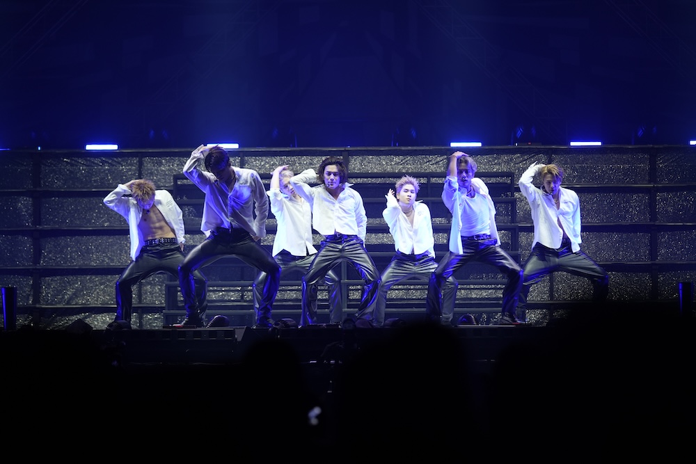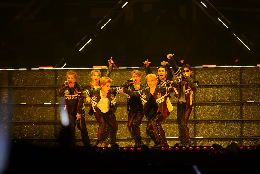 グループの状態が非常にいいことは囲み取材からも伝わってくる。そんな彼らのライブの幕が上がる。オープニング映像が終わると、バンドがステージで演奏をスタート。メンバー一人ひとりの名前、そしてシルエットもモニターに映し出される。いよいよメンバーが登場するかと思いつつ、実はステージに映し出されているのはダミー。本人たちは「Most Wanted」で客席に登場し、オーディエンスを驚かせる。松井の「できたばかりのこの会場に、俺らが伝説を作りに来ました!」で、「Get Wild」へ。客席を歩きながらステージに戻り、「HIGHER EX」へと繋がっていく。「CRASH」では、日髙竜太が「拳を上げて、全員の声を聴かせてください!」とオーディエンスたちに声を出させていく。その後も「Drop Dead feat. TRINTIY」、「We never die」、「テンハネ -1000%-」とアッパーな曲で一気にオープニングパートを駆け抜けていった。