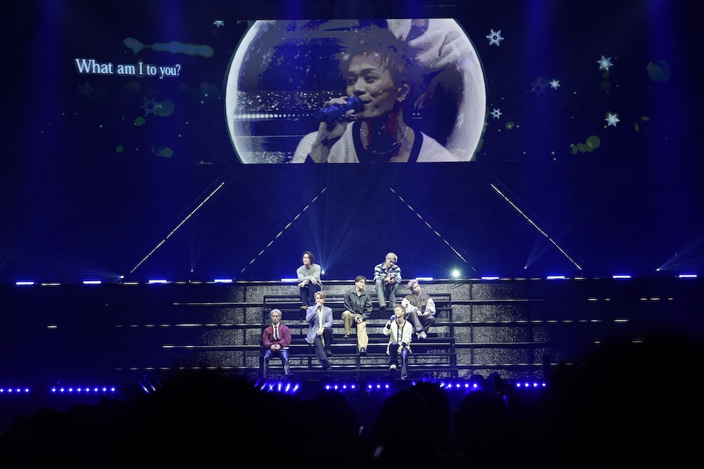 MCタイムで1人ずつ感想を述べていく中、海沼は「ペンライトが綺麗。本当にありがとうございます」と会場を見渡す。そんな海沼に「『綺麗だね』って言うお前のほうが綺麗で困ったな」と深堀が意味深発言。そんな“匂わせ”の後、「皆さんにとってこの曲が大切な曲になりますように」という加納の曲振りで11月14日にリリースしたばかりの新曲「Winter Glow」がスタートする。階段に座ってメンバーが歌い上げていくと、会場は一気に冬の空気に包まれていった。