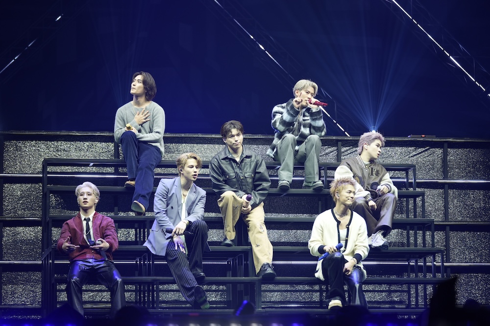 続いては、日替わり曲コーナー。1日目では「In My Eyes」、「HIGHWAY」を披露したが、2日目にあたる本公演では日髙、加納嘉将、深堀、砂田による「good day good night」、海沼流星、奥田力也、松井による「マーメイド」が披露された。そして、「まだまだ最高のステージを用意しているので、最高の思い出を更新していきましょう」という松井の言葉で「360°」へ。メンバー同士目を合わせたり、じゃれ合ったり、楽しそうに7人揃ってパフォーマンスをしていった。