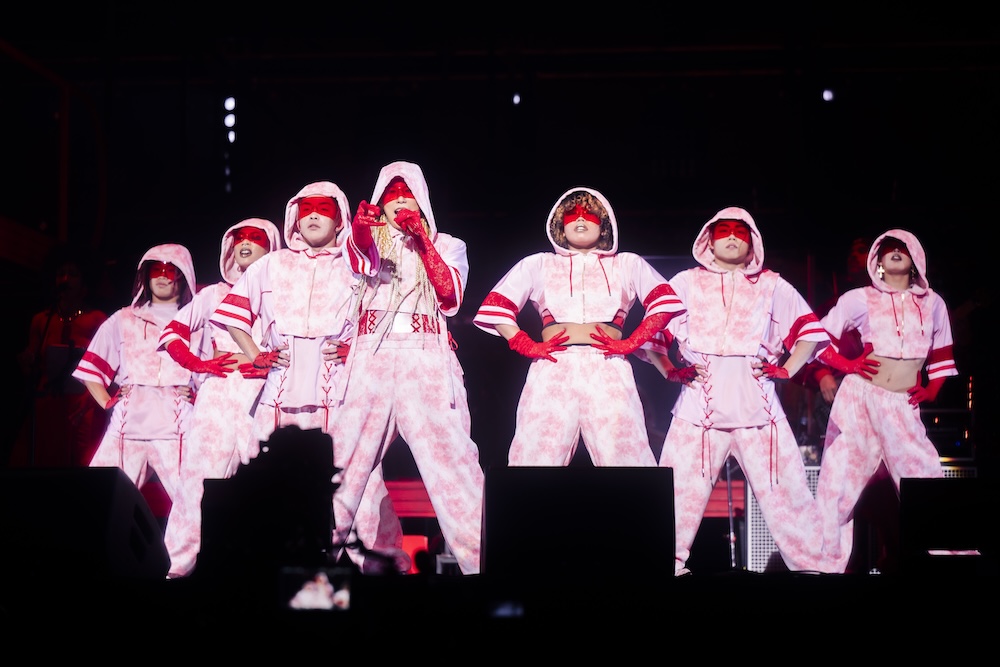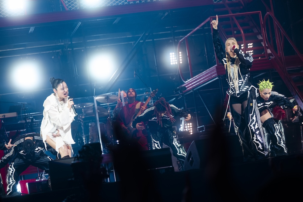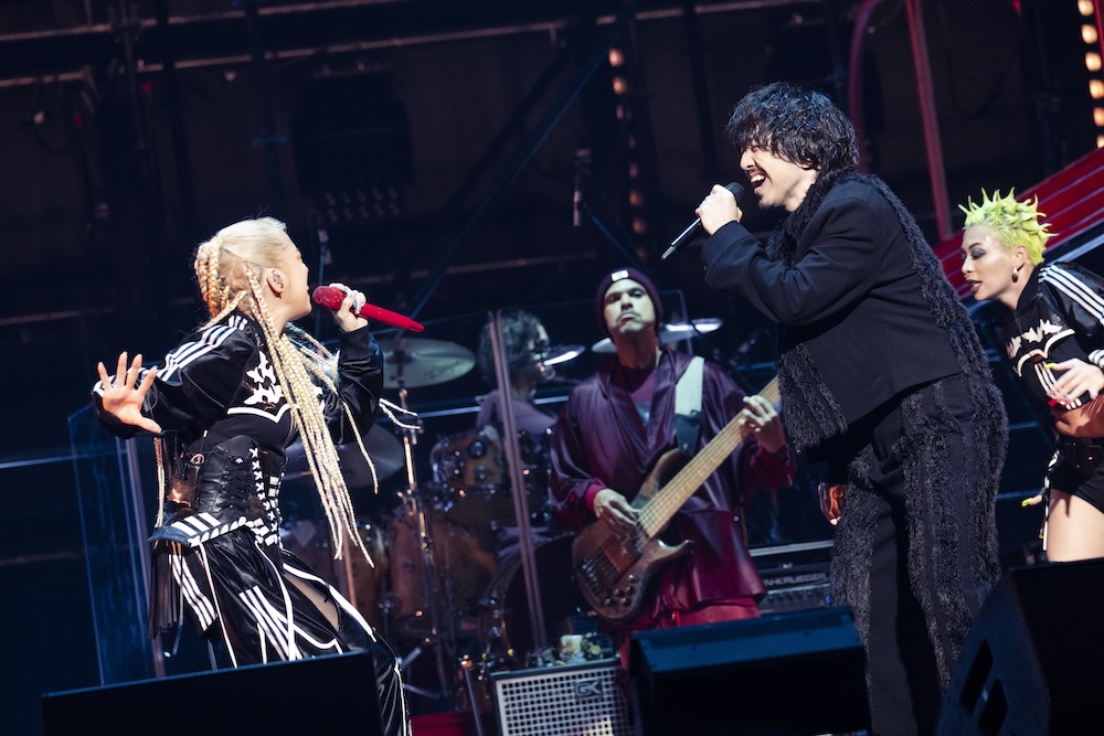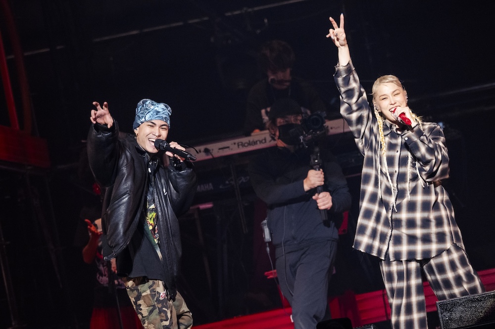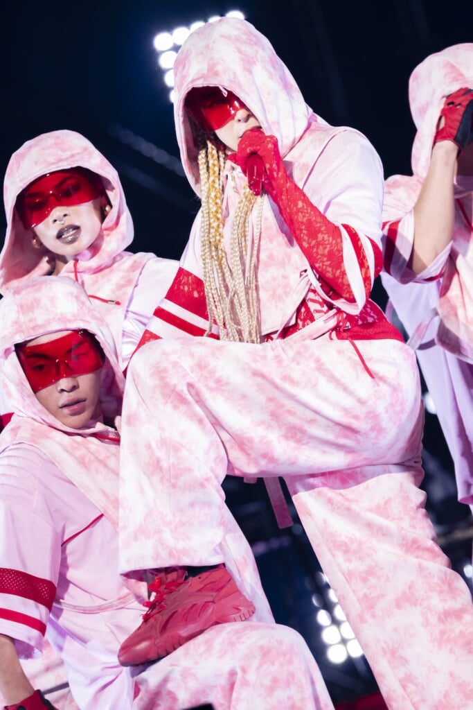 「Bad Bitch美学」「生者の行進」とヒップホップ系ナンバーを繋げ、ここからライブは後半へ。「IN THE MIDDLE feat. 三浦大知」では三浦大知が登場し、“真ん中でいよう”というメッセージを込めたリリックを二人で歌い上げる。間奏のパートでもキレのいいダンスで盛り上げまくった三浦はやはり生粋のエンターテイナーだ。