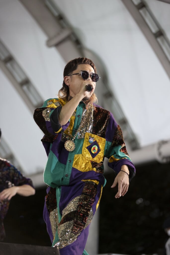 ライブ開演の17時55分、ステージにC&Kが登場し「C&K Ⅸ」からライブがスタート。「to di bone」「へべれけ宣言」「梅雨明け宣言」とアップテンポなナンバーで一気に盛り上げ、市民の憩いの場の公園が一瞬にしてフェスさながらのライブ会場と化した。