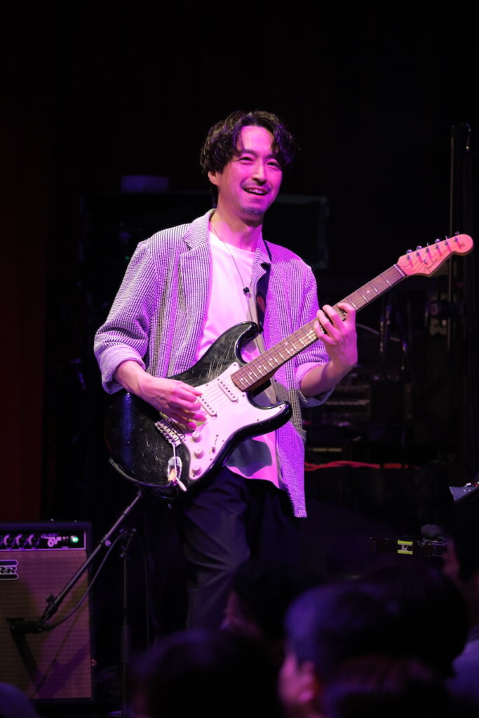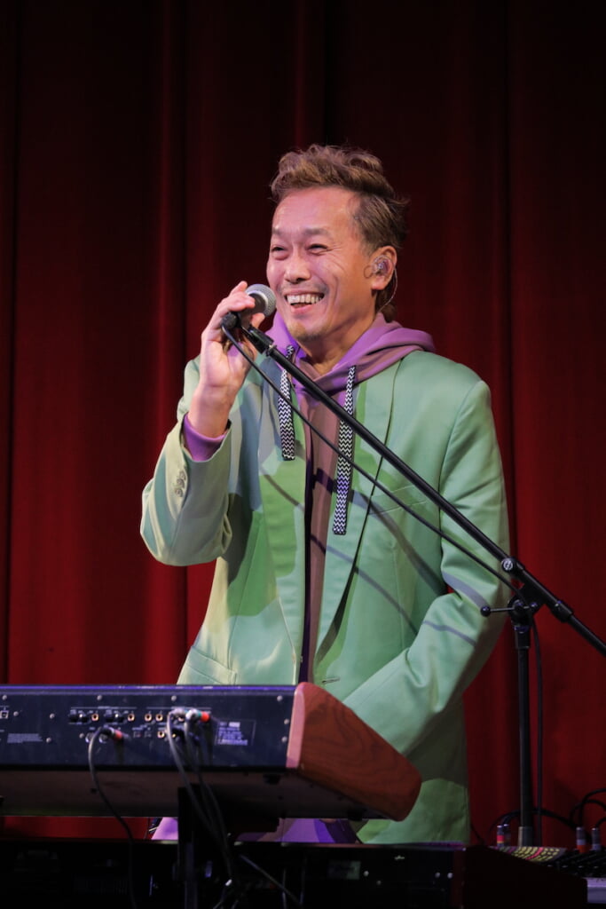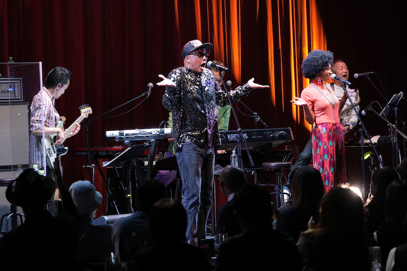 落ち着いた大人のムード漂う会場。温かい拍手に迎えられてメンバーがステージに現れる。1曲目の「Yah-Mo」は、キーボード/バンマスの小倉泰治によるオリジナル曲で、ダニー・ハサウェイなどをリスペクトしてこの日のために作った新曲とのこと。グルーヴ感あふれる演奏に手拍子が重なり、次々と繰り出される各楽器のソロパートには、その都度歓声が上がった。「ウェルカム!」という挨拶をボコーダーで発するなど、冒頭から遊び心たっぷりだ。続いてマーヴィン・ゲイのカバー「Inner city blues」を繰り出す。ベースの小松秀行とパーカッションの斉藤ノヴが繰り出すジャジーなリフに乗せて、サックスの鈴木明男が艶めかしくメロディーを奏で、植田浩二がエモーショナルにギターをプレイ。そんな演奏に拍手と歓声が沸き起こると、「今日は我々の初公演にお越しくださってありがとうございます。最後まで楽しんでください」と、小倉が挨拶をして歓声に返した。
