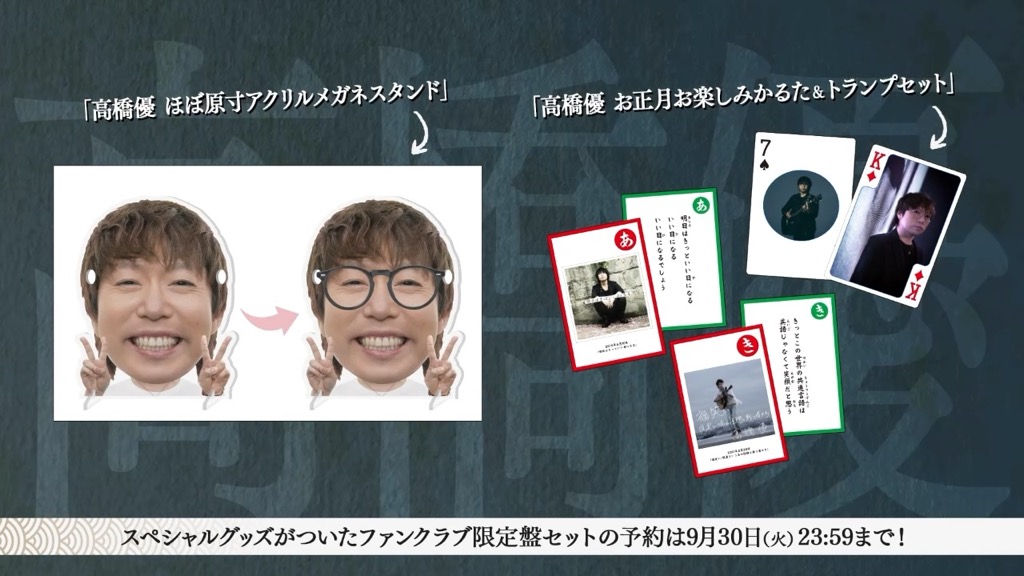 ※グッズは「高橋優 ほぼ原寸アクリルメガネスタンド」「高橋優 お正月お楽しみかるた&トランプセット」の2種から購入時にお選びいただきます。