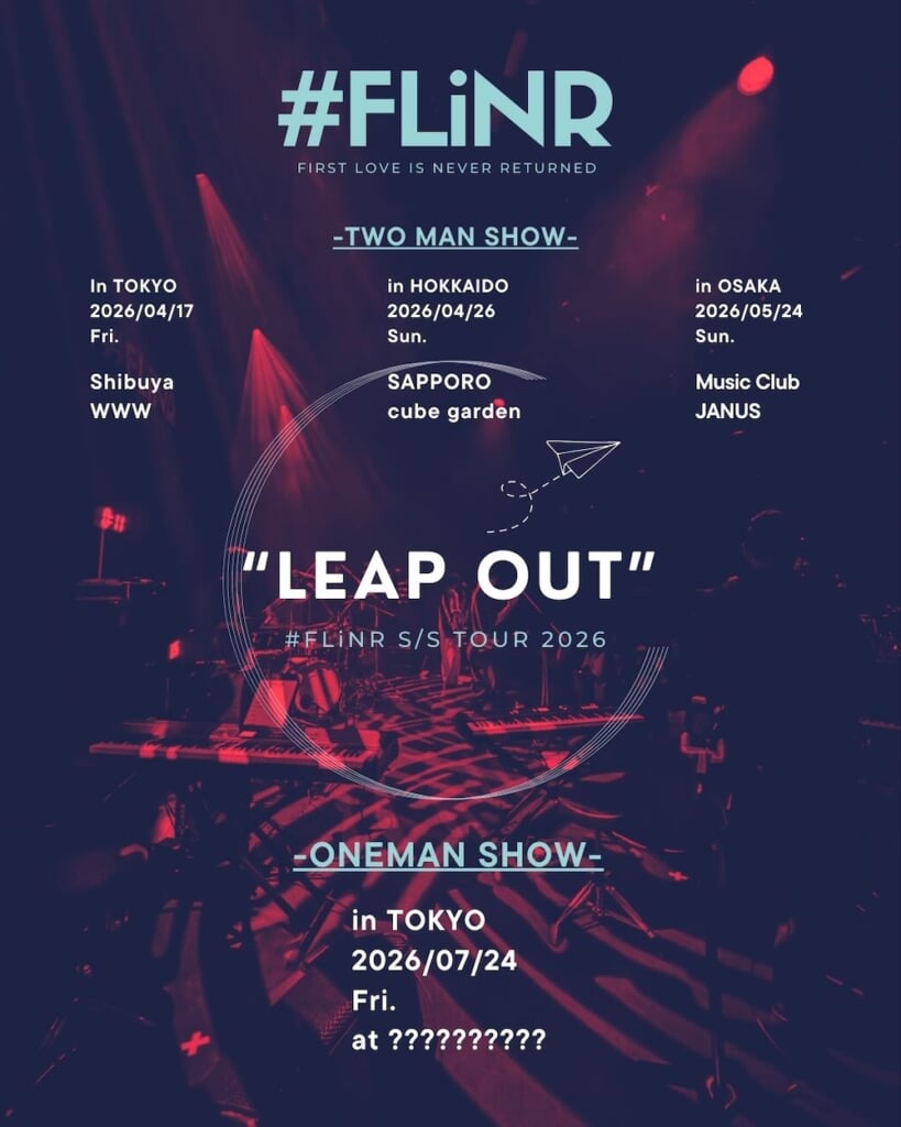 今日はそのまずひとつ、来春からのツアー「#FLiNR S/S TOUR 2026 “LEAP OUT”」を発表します。僕らにとっては初の対バンツアー。今年行った[WHAT IS “POP OUT”?]というワンマンツアーを経た僕らにとっては、多くの刺激と出逢いを得るための時間にしたいし、あなたと一緒に多くの音楽に出逢うための時間を創りたいと思っています。