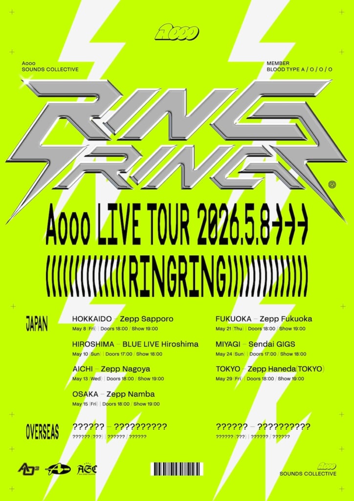 同情報は、12月6日に東京ガーデンシアターで開催されたワンマンライブ<Aooo Special Live 2025 “Bazoooka”>にて発表された。国内は札幌・広島・名古屋・大阪・福岡・仙台・東京の7都市。さらに海外公演も予定している。海外公演の詳細は後日発表予定とのことなので、続報を楽しみにしてほしい。<Aooo Live Tour “RINGRING”>のチケット最速抽選申し込みは本日から12月21日23時59分まで。本日開催されたワンマンライブは一般発売開始からわずか4分でソールドアウトしたとのことなので、早めのチェックをお勧めしたい。