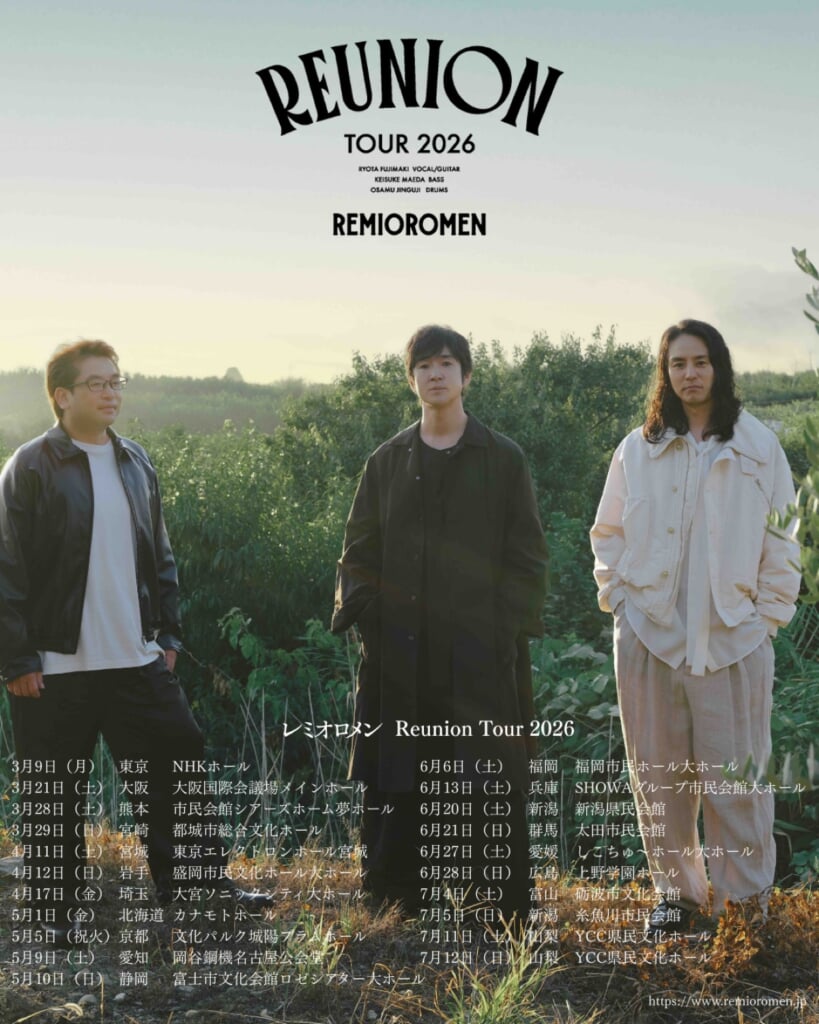 オフィシャルYouTube channelでは、代表曲である「雨上がり」「粉雪」のスタジオライブが披露され、三人の最新映像が公開。オープニングでは、再結合を意味する“Reunion”の文字が大々的に表示され、エンディングでは、<レミオロメン Reunion Tour 2026>の開催を発表。15年ぶりとなる全国ツアーは、3月9日に東京・NHKホールから始まり、ファイナルとなるメンバーの地元山梨・YCC県民文化ホールでの2daysまで、全21公演となる。チケットは、12月6日21:15よりオフィシャルサイト先行がスタートしている。