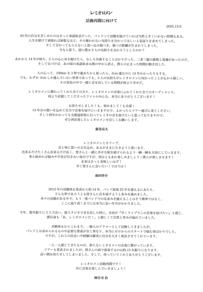 レミオロメンが2025年12月6日、活動再開とメンバー全員からのコメントを発表した。