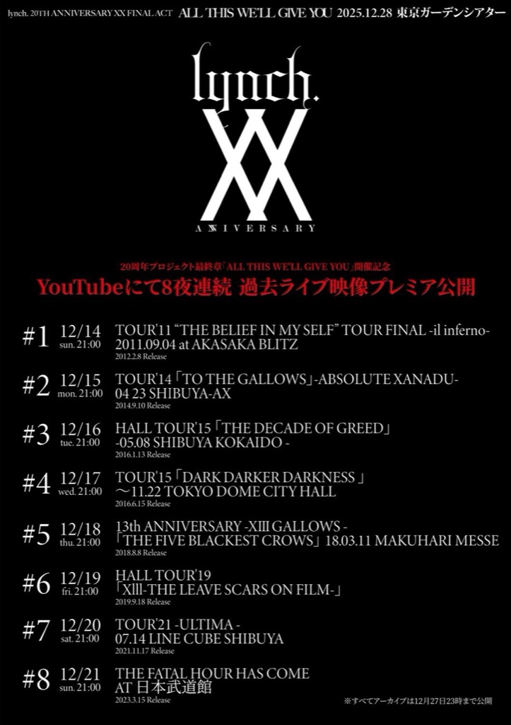 lynch.が20周年プロジェクト最終章となる公演<lynch. 20TH ANNIVERSARY XX FINAL ACT「ALL THIS WE’LL GIVE YOU」>の開催を記念して、12月14日より8夜連続で過去ライブ映像をYouTubeプレミア公開することが決定した。
