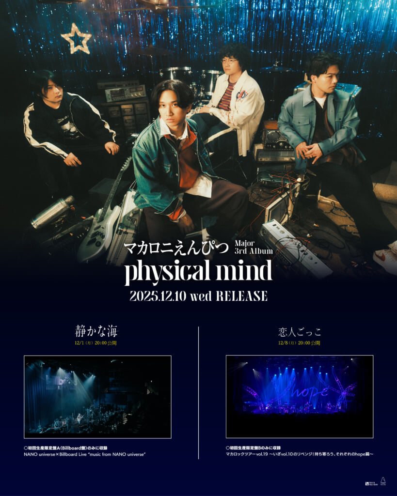 マカロニえんぴつはアルバム『physical mind』を引っ提げて2026年1月より全国19都市25公演のホールツアーを開催する。