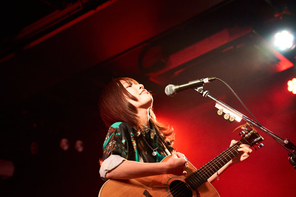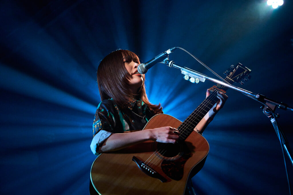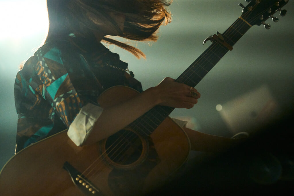 観客のクラップに乗せて「満ちて欠けて」を軽快に歌った後はハンドマイクにチェンジし、続いては爽やかなサウンドの「恋知らず」を歌う。ひらひらと舞う桜の花びらを想起させるファルセットで、会場を春色に包み込んだ。再びギターを抱えると、「この日にぴったりな、上京して初めて作った大事な曲を歌いたいと思います」「いろんな感情から出来上がった曲なので、帰る場所を思い出しながら聴いていただきたいです」と呼びかけて歌い始めたのは、彼女が高校1年生の頃に制作した「この街」。確かな信念を透き通る歌声に乗せて歌う姿は、とても凛としていた。
