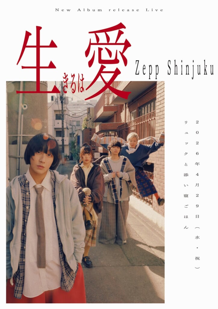 また、アルバムを引っ提げたワンマンライブ<リュックと添い寝ごはん New Album release Live「生きるは愛」>を2026年4月29日に東京・Zepp Shinjukuで開催することも決定した。ただ今よりファンクラブ会員限定最速先行受付が開始されているので、こちらもあわせてご確認いただきたい。