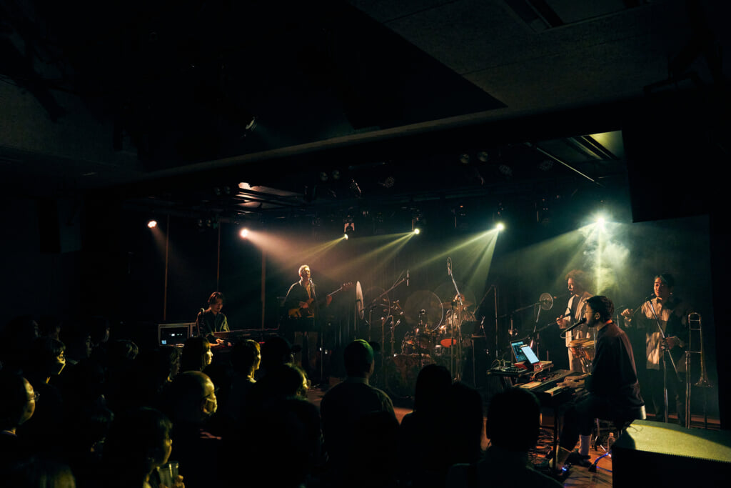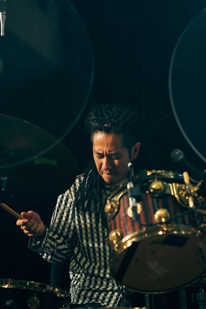 キーボードとホーンによる静かな波のうねりが次第に高まり、JacksonのリズムとRyuのスキャットが荘厳なムードを作り出す、オーバーチュアの演奏からいきなりかっこいい。1曲目はアルバムと同じ「ATOMS」だ。心臓のパルスを刻むJacksonのドラムに乗せた、Ryuの艶やかなファルセットがまるで讃美歌のように吹き抜けの天井に響き渡る。森山公稀(Key/Synth)、Zak Croxall(Bass)、竹内悠馬(Trumpet)、大田垣正信(Trombone)の奏でる音は、低音はクラブミュージック並みのド迫力で、それでいて繊細なニュアンスを大事にした彩り豊かなもの。一言でいえば、強くて優しい。