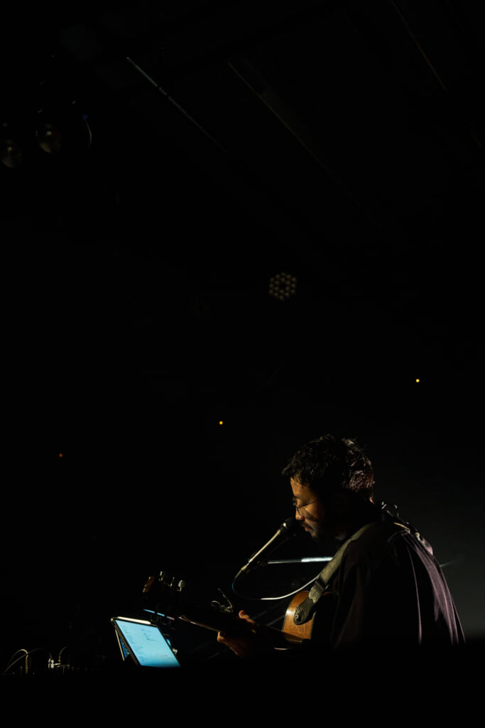中盤からはスロー&メロウな曲がぐっと増え、さらにディープなRyu Matsuyamaの世界へと入り込んでゆく。Ryuのピアノの爪弾き、Jacksonのスネアのひと叩き、ミニマムな音の重なりが作る音の波の中をトロンボーンのソロが泳ぐ「me to me」、Ryuがアコースティックギターに持ち替えて、ハイトーンの美声を響かせて朗々と弾き語る「Kaze」。極めつけは幽玄なシンセサイザー、どこか異国のトラッドを思わせる素朴なメロディ、RyuとJacksonのハーモニーが溶け合い、宇宙的と呼びたい広大な音空間が目の前に広がる「絶景 feat.KUDANZ」だ。深海を思わせる深いブルーなど、曲に合わせた照明の演出も美しい。ライブ中盤はスロー/ミディアムの曲が並び、ノンストップで多幸感が持続する至福の時だ。