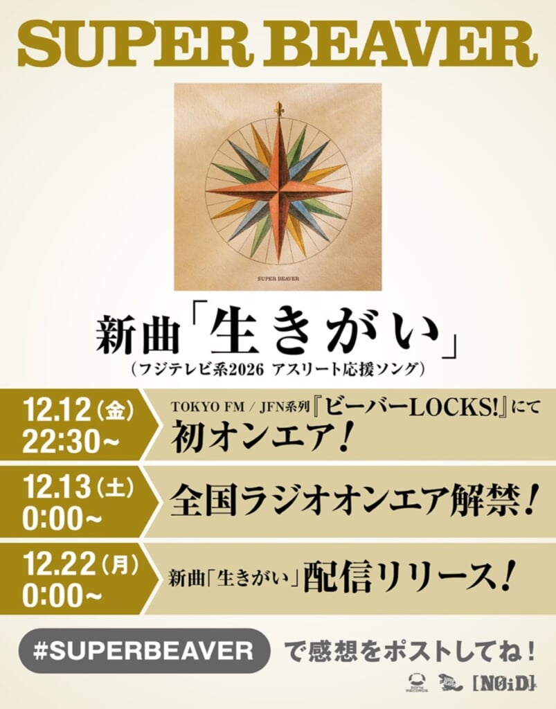 さらに、12月12日(木) 22:30〜 TOKYO FM / JFN系列にて放送の『SCHOOL OF LOCK!』内のSUPER BEAVERのレギュラーコーナー「ビーバーLOCKS!」にて、「生きがい」のフルサイズがラジオ初オンエアが決定。12月13日(金)0:00以降は全国のラジオステーションでもオンエア解禁される。