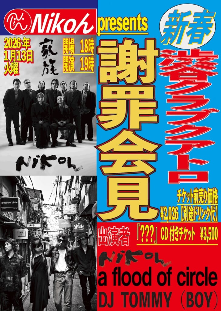 1月13日に東京・渋谷 CLUB QUATTROで行う自主企画<Nikoん presents 新春 謝罪会見>には、a flood of circleとDJ TOMMY(BOY)が出演することが発表されており、そちらもチケット発売中だ。