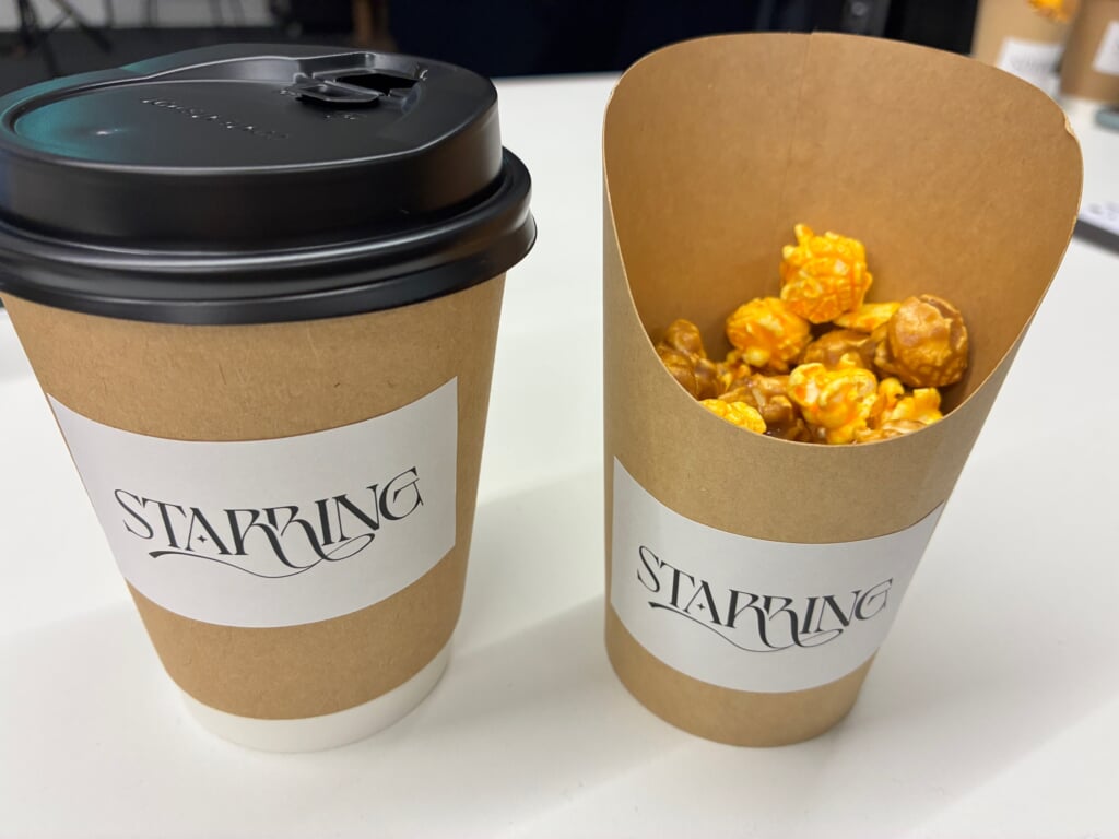 会場内では、ポップコーンとコーヒーが“STARRING”のステッカーを貼った特製カップで振る舞われ、まるで映画館に足を運んだかのような気分に。アルバムの世界観に寄り添った細やかなホスピタリティからも、制作陣の熱量が伝わってくる。