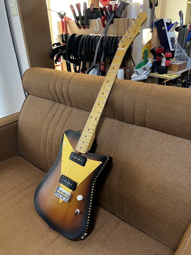 元々レトロなビザールギターが好きだったクラフトマン片田は、可愛いけれど弾きにくいというビザールギターのイメージをそのままを作るのではなく、”トラディショナル”なパーツを基本にしながら実用性を考え”モダン”なパーツを取り入れて現場でも通用する確かなサウンドと弾きやすいギターを目指している。