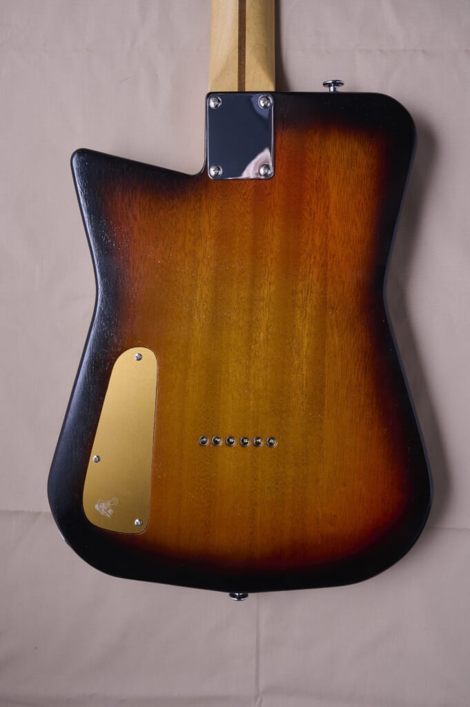 メイプルネックに40㎜と薄めのマホガニー材のボディー、3トーンサンバースト。
