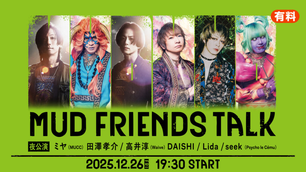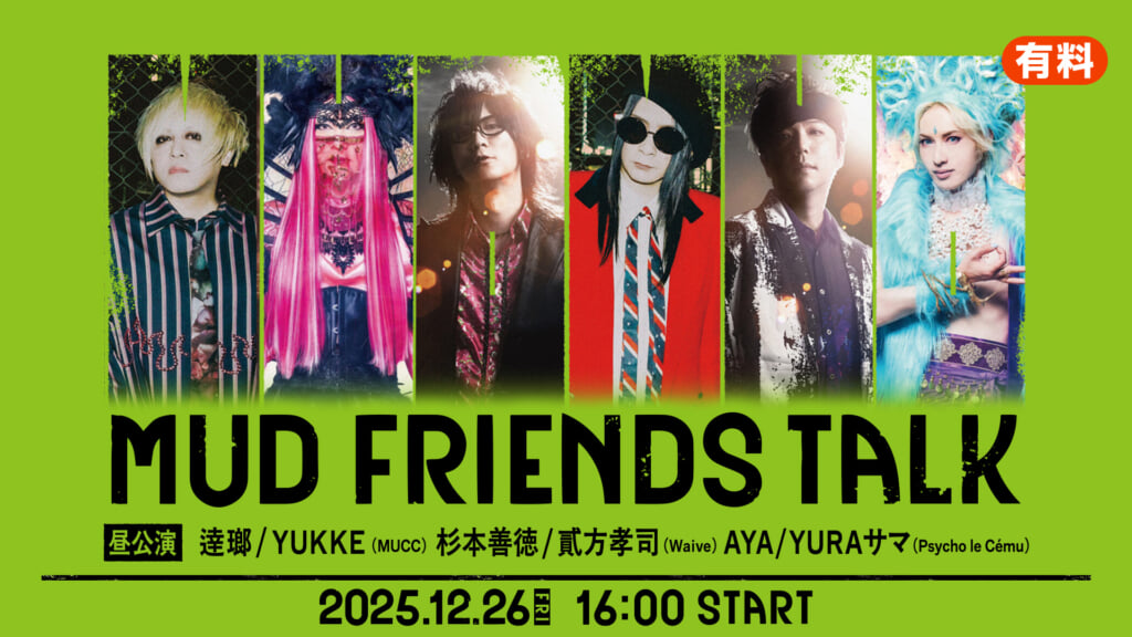MUCC×Waive×Psycho le Cémuといった3バンド集結によるトークイベント<MUD FRIENDS TALK>が12月26日、渋谷PLEASURE PLEASUREにて昼夜2公演で開催される。同トークイベントの配信が決定したほか、先ごろ配信された『MUD FRIENDS 2000~2025 開催直前SP特番』のアンコール放送が12月24日より実施されることも発表となった。