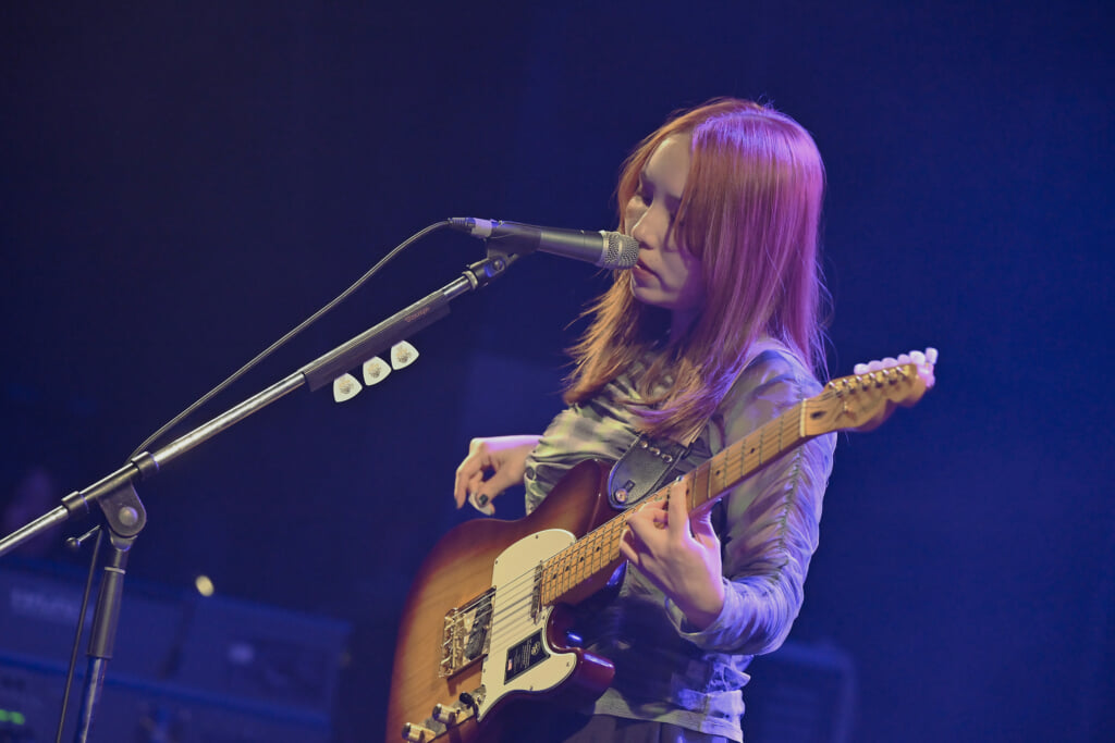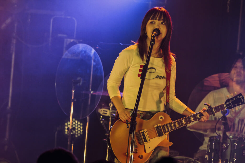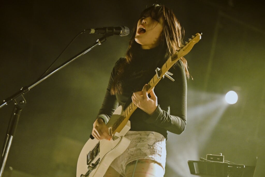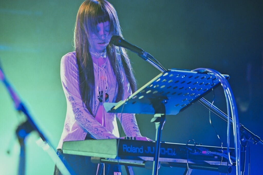 一軒家の輪郭をなぞるように配されたライトがふわりと光る中、「ホワイト・リバー・ジャンクション」でiVyのアクトが幕を上げた。タフで存在感を放つようになったfuki(G, Vo)の歌声は即座に会場へ染み渡っていくのだが、やはりiVyをiVyたらしめているのは、吐き出したロングトーンをひと息で回収するみたいな唱法や数行のポエトリーリーディングを筆頭とする、悲劇をその声に抱え込んだ歌唱なのだろう。そして、そんなボーカリゼーションは“君の声も指も嘘も足も歌も いらない”なんてリリックと連動しながら、今にも終わってしまいそうな世紀末を描き出していくのだ。