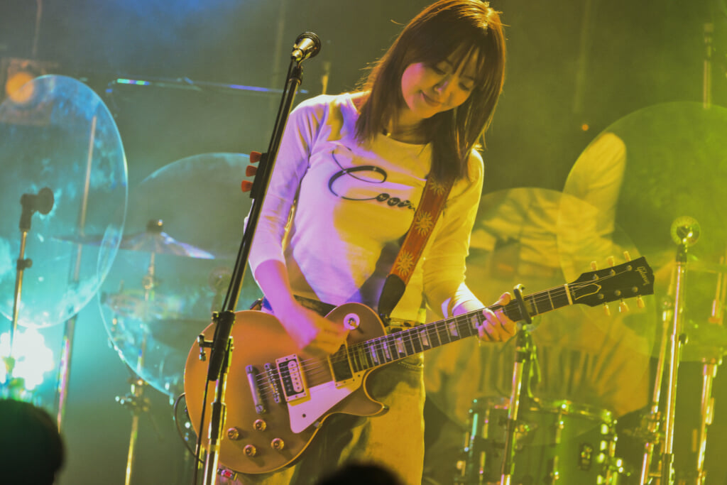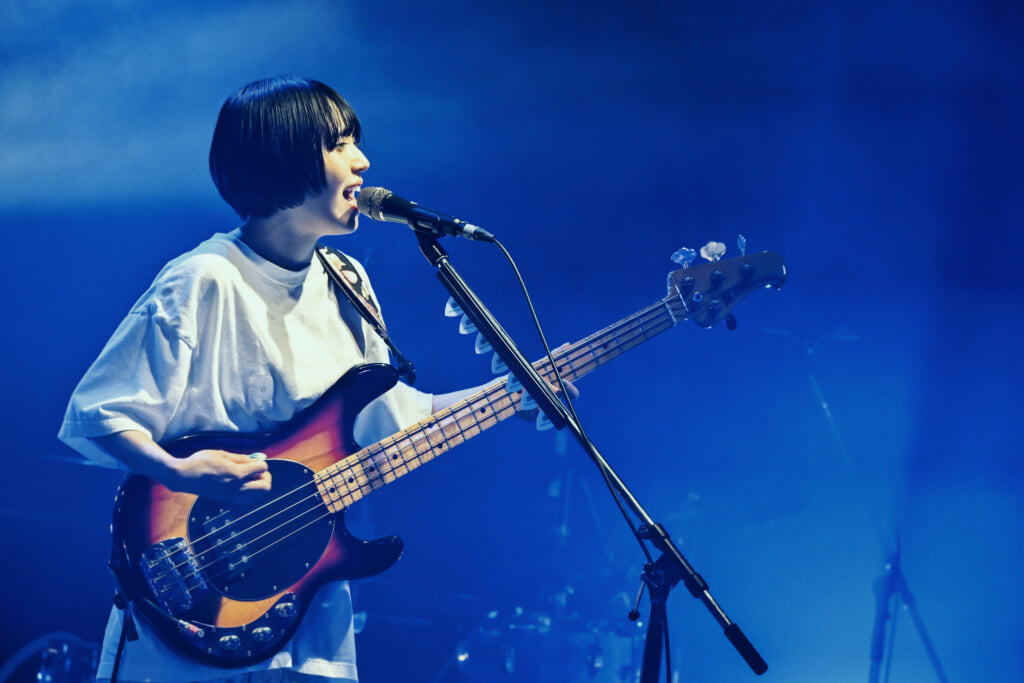 「LIQUIDROOMいけますか!」と軽やかに誘った「Super Express」から「アボカド」を連ねたライブ冒頭で、良い47都道府県ツアーを回ってきたのだと思い知らされた。誤解を恐れずに記せば、決してyonigeはエネルギーを外へと放射していくバンドではなかったし、「アボカド」が形成したパブリックイメージから逃れたがっていたように思う。しかし、現在の彼らは至極当然のことして観客をアジテーションし、「愛しあって」が生まれ落ちるまで封印されていたラブソングたちを躊躇いなしにやってのけている。この変化の背景には、2024年1月に世へ放ったアルバム『Empire』があり、先日終えたばかりのドサ回りがあり、これまで以上にライブを重ねていく中で自然と発生していった4人の連帯感が横たわっているのだろう。