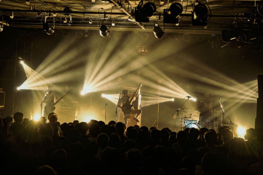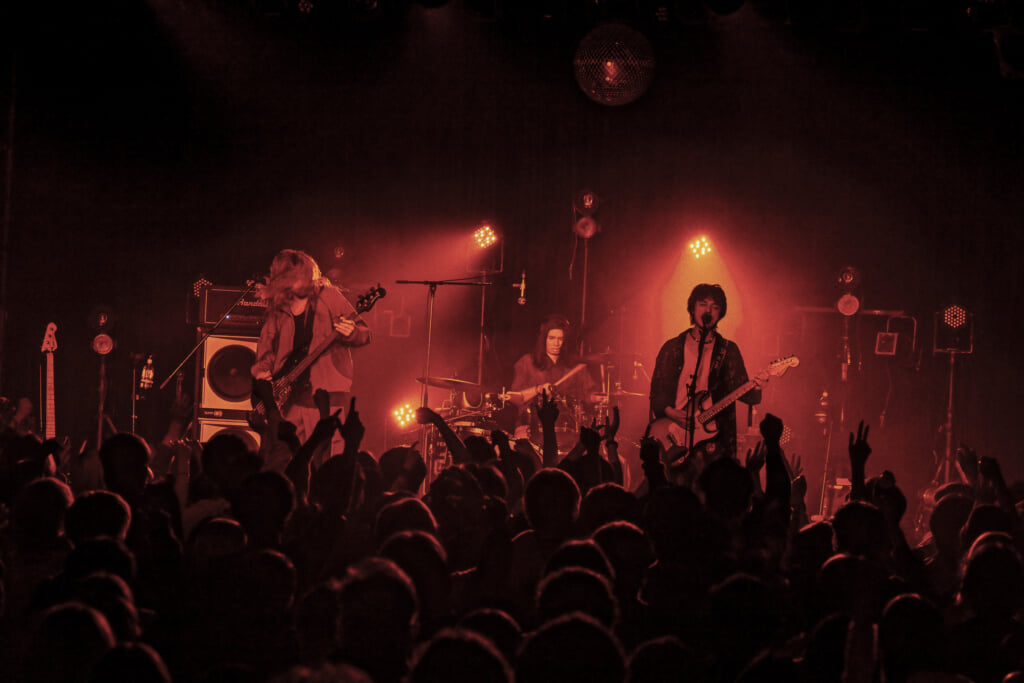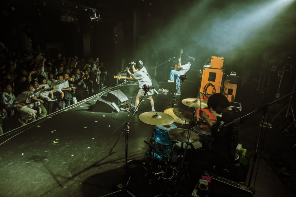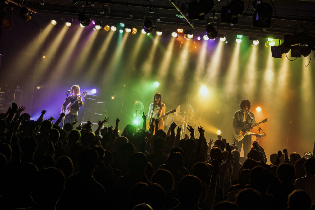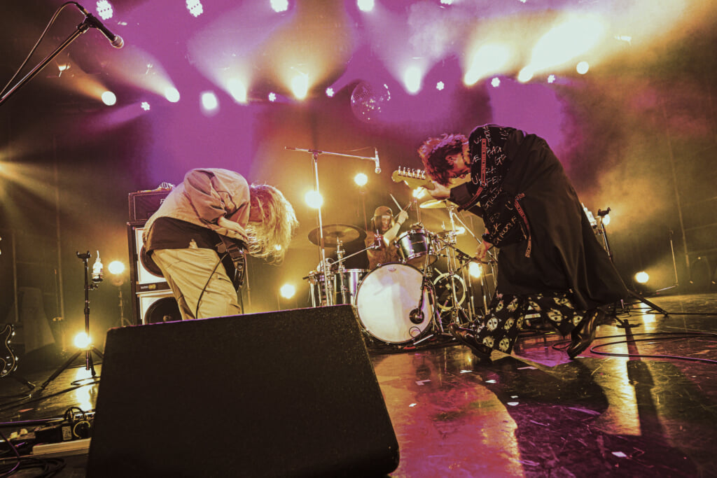 「カッコいいギターから始めます」とプレイした「STARS」や「1994」を筆頭に、凶暴なリズム隊と土煙を巻き上げるギター、ロマンチシズムを垂らした歌詞が三位一体となって次から次に飛来する最中、彼らはオープニングナンバーに「TOKYO CALLING」を、ラストに「My Generetion」を配置。グリッチノイズにも似た電子音がぐにゃりと視界を回転させ、5つ打ちからビートが変容していく前者も、繰り返される“Ok Alright now”で最終行へブーストしていく後者も、ストイックで無骨なロックバンド像をビビッドに刷新していく。これでもかと飛び跳ねるフロアを染め上げていた虹色のライト。それは彼らがフィルム写真のようなセピアカラーやモノトーンに留まらないバンドへ、脱皮を続けていると裏付けていたのである。