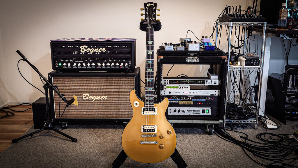 こりゃまたお宝。TAK DCであるということのみならず、コリーナ・ボディ&ネックというスペックだけでも至宝なわけですけど、これをゴールドトップに塗りつぶしてしまうという漢仕様に震えますなぁ。いわゆる「脱いだら凄い」ブツでございますが、当然ながら決して脱がないという孤高のモデル。コリーナの抜けと粘るようなハムバッカーの組み合わせは、TAKサウンドを楽しむ点でも至高のモデルかと。そして後ろにはエクシタシーと212CB。私も持っていましたので、そのサウンドの極上ぶりは存じております。最高な日々をお送りですね。(BARKS 烏丸哲也)