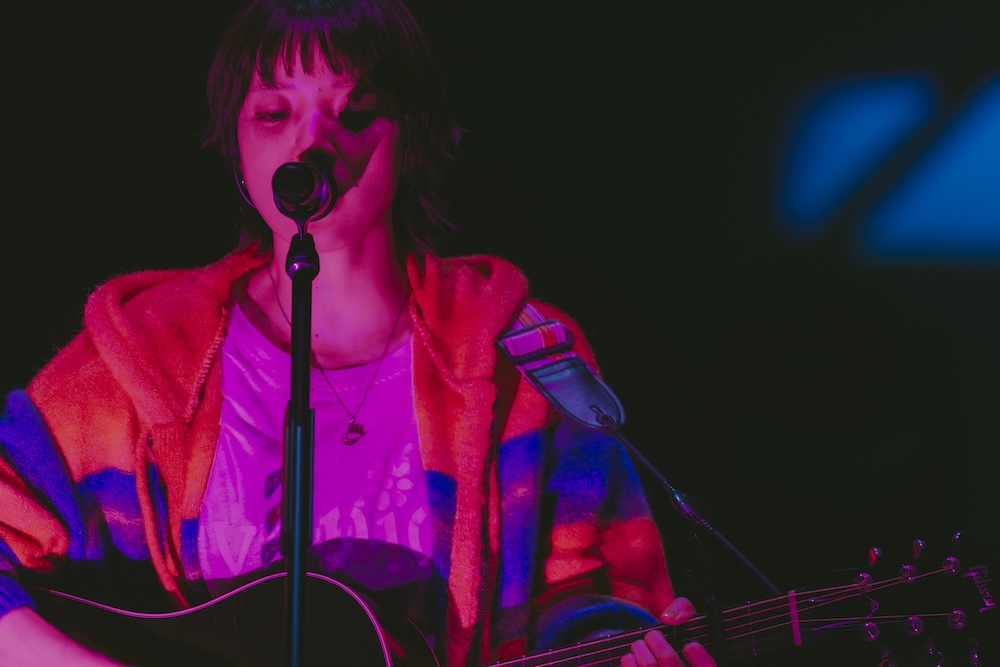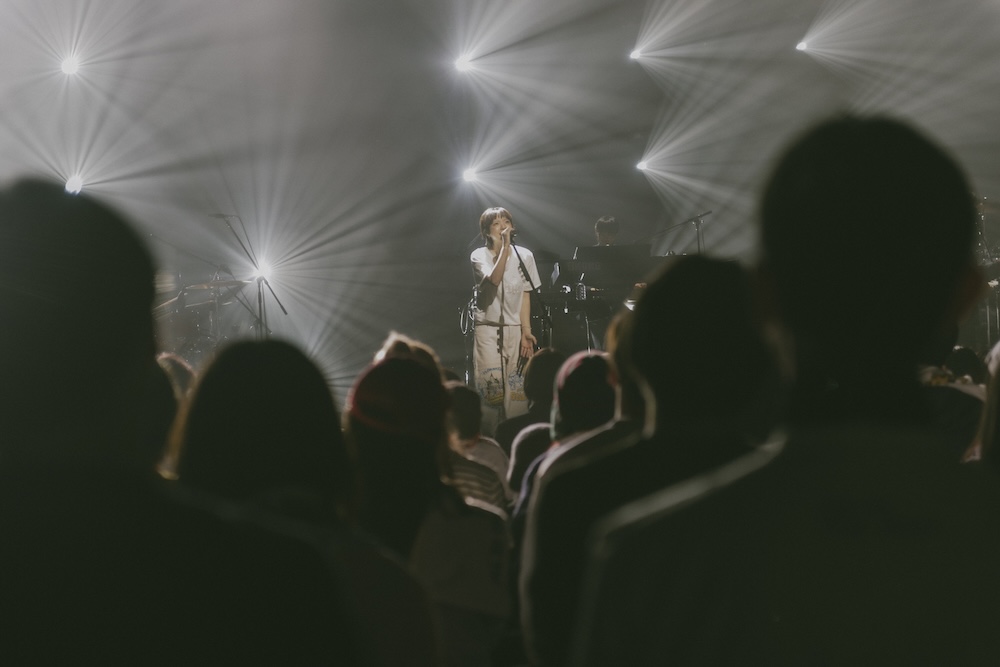 開演時刻を過ぎてあいみょんがステージに登場すると、ライブは「愛の花」からスタート。前半は弾き語りでしっとりと聴かせ、途中からサポートメンバーの演奏が加わり、スケール感のある歌声を響かせていく。最初は椅子に座ってじっくりと聴いていたオーディエンスも、続く「初恋が泣いている」から徐々に立って体を揺らし始め、3曲目の「マリーゴールド」では総立ちになり、サビでは一斉に手が振られて、早くも場内には一体感が生まれていた。