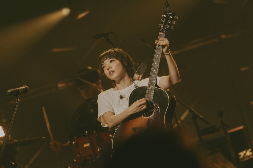 恒例の双眼鏡コーナーでは、「この中にお医者さんはいますか?」「教師はいますか?」「今日誕生日の人?」などと呼びかけて、オーディエンスと直接コミュニケーションをとり、場内が笑いに包まれるのもあいみょんのライブの醍醐味。そこから再び演奏に戻り、手拍子が楽しい「今夜このまま」に続いて、「鯉」ではギターのクロちゃんことqurosawaと八橋義幸がソロの応酬で盛り上げる。「二人だけの国」で少しクールダウンすると、弾き語りで披露されたのが「恋をしたから」。ピンスポットに照らされ、アコギ一本で切々と歌い上げるスタイルは、やはりシンガーソングライターとしてのあいみょんの真骨頂。同じく弾き語りから始まり、徐々に演奏が加わっていった「いちについて」のラストではステージが眩い光に包まれて、中盤のハイライトに。続く「さよならの今日に」のロックな一面もまた非常に魅力的だ。