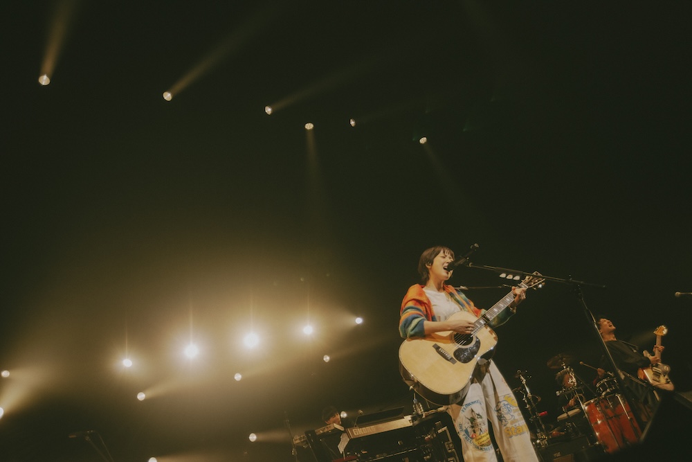 「まずはみんなの声を聴かせてもらいたい。みんなの元気なアレを聴かせてもらえたらと思います」という曲紹介からの「ふたりの世界」では、オーディエンスの「セックス!」のコールもバッチリで、パーカッションの朝ちゃんこと朝倉真司が様々な楽器を駆使する遊び心も楽しい。サビでサポートメンバーが順番に歌声を披露する「駅前喫茶ポプラ」では、ラストの<マスター、いつもの レモンの効いたチーズケーキを 彼女に、ひとつ下さい>という歌詞を、各都市の名物に変えて歌ってきて、この日は「水戸納豆トーストを 彼女に、ひとつ下さい」と歌う一幕も。さらには凛とした伸びやかな歌声が印象的な「ジェニファー」、切ない世界観の「3636」と、曲ごとに様々な表情を見せていく。