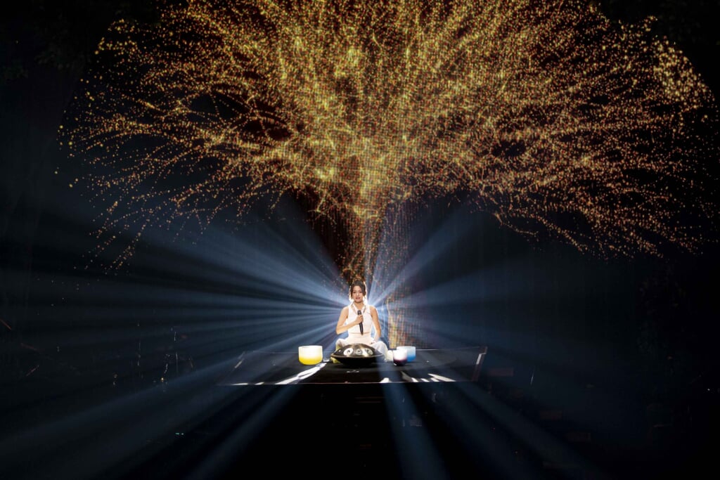 鳴りやまない手拍子に呼び戻されて、アンコールは2曲。緑の森を背景に、カラフルなデニムにラフなTシャツ姿でハンドパンを器用に叩きながら「リラック素~What a wonderful world~ (432Hz chill mix)」を歌う、それはまるで音によるリフレクソロジー。ちなみに“432Hz”とは、リラックス効果をうながす宇宙の周波数とも言われる特別な数字。歌いながらステージに寝転がってみせたり、おちゃめなパフォーマンスも可愛くて楽しい。