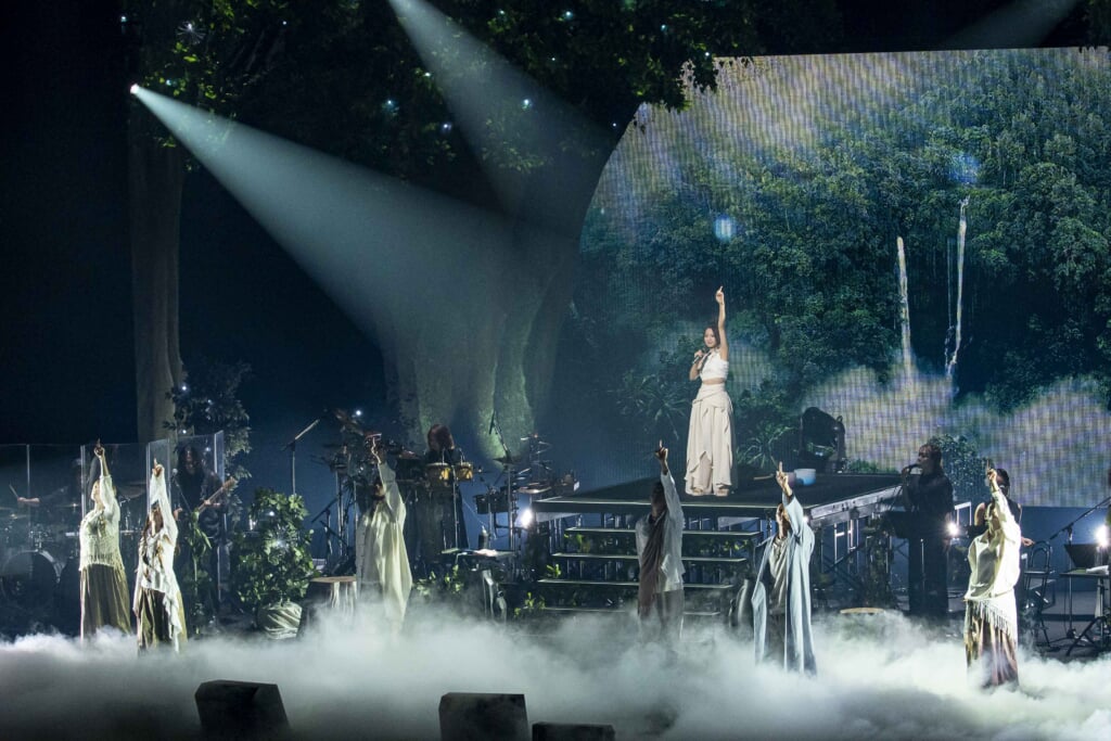 冷たい雨に打たれて苦悩するシーンから、穏やかな水と緑の森へ、倉木麻衣自身が演じるオープニング映像から一気に引き込まれる。ステージ中央の階段上でスポットを浴び、安座してアカペラで歌い上げる1曲目「Voice of Safest Place」から「Love one another」へ、オフホワイトの衣装の彼女の周りを、森の精のようなスタイルで登場したダンサーたちが華麗に舞い踊る。さらに、自らハンドパンと呼ばれる打楽器を操って異国情緒溢れるサウンドを聴かせると、「きみへのうた」では客席いっぱいに緑に広がるペンライトの光に手を振って応え、「Forever for you」ではハンモックに腰かけて伸びやかな歌声を響かせる。「風のららら」はボサノバにリアレンジされたサウンドがとても心地よく、「Sea wind」は青い海と白いビーチの映像をバックにパラソルを持ってゆったりと歌唱。1曲ごとにミュージックビデオを見ているようで、ドラマチックな展開に序盤から目が離せない。
