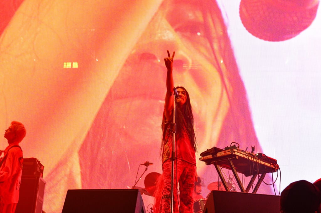 BUCK∞TICKの世界観のあとに続けるバンドは限られていると思うけれど、そこは<尽未来祭>でしかあり得ない流れが実現。GEZANの登場だ。真っ赤な照明のなかに仮面を被ったマヒトゥ・ザ・ピーポーが現れ、「<尽未来祭>、30年ぶん踊ろうぜ」と誘うと、会場はトライバルなビートに満たされていき、オーディエンスの心身が解放されていく。そんななかでマヒトは、当たり前のように起こった手拍子を「手拍子、ダサいんでやめてください」と静止した。しかし、それはオーディエンスを突き放しているわけではなく「東京」では「おめーらの曲だ!」と叫んだり、真っ青に染まった「Blue hour」では「手のひら見してみな」と呼びかけたり、入り口は大きく開け放っていた。曲調だって「DNA」を筆頭に、琴線を震わせるようなキャッチーなものも多いのだ。いわゆる“お決まり”はダサい、自由にやろう、一人ひとりの想像力を膨らませて、確固たる意志を持って──そういうメッセージだと私は受け取った。