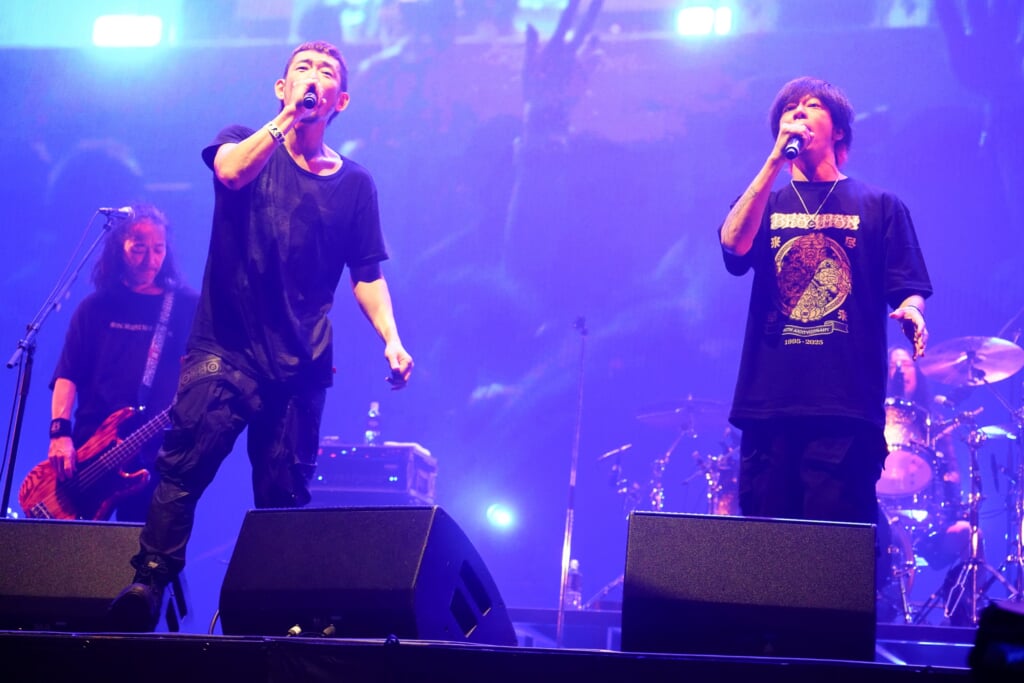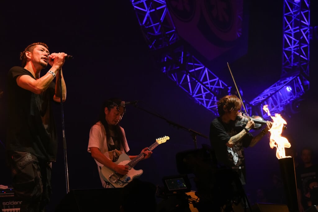 しかも今のKjは、身体も言葉も歌も身軽。「音楽を通して、ロックバンドを通して、皆さんに言いたいことはひとつだけです……踊れー!」と無邪気に叫ぶ姿には、いろいろ背負い続けてきた彼の、彼らの辿り着いた現在地が浮き彫りになっていたと思う。セットリストも秀逸で、彼らの闘いの歌「百合の咲く場所で」「Viva La Revolution」は、別の場所で、別のやり方で、でも同じように闘い続けてきたBRAHMANへのエールにも聴こえた。そしてhide「ROCKET DIVE」のカバーは彼らの鉄板メニューのひとつであり、もう会えない仲間たちも愛し続ける意志や、ジャンルレスな客層へ扉を開く姿勢に見えた。
