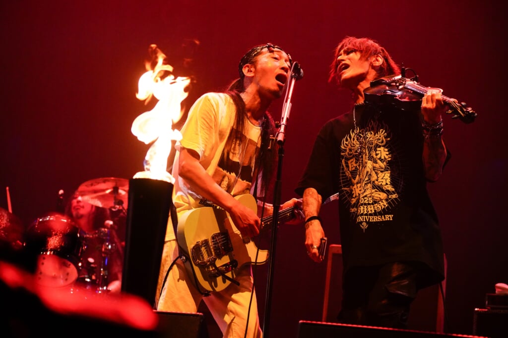 続いては「メンバーのように自然すぎる」ゆえに途中まで紹介されなかったSUGIZO(LUNA SEA)がバイオリンで参加し、「鼎の問」「満月の夕」を披露。そもそもBRAHMANとLUNA SEAの繋がりは、TOSHI-LOWとSUGIZOが東日本大震災で泥にまみれながら復興支援に尽力しているうちに絆を深めていったところに端を発する。見た目も音楽も違うフィールドにいるように思えるけれど、丸裸になった、ならざるを得なかったあのとき、同じ行動を起こしたふたりが奏でるハーモニーが、強く美しくないわけがないだろう。