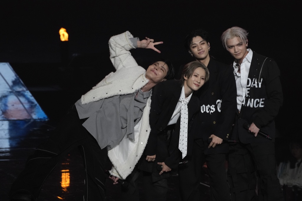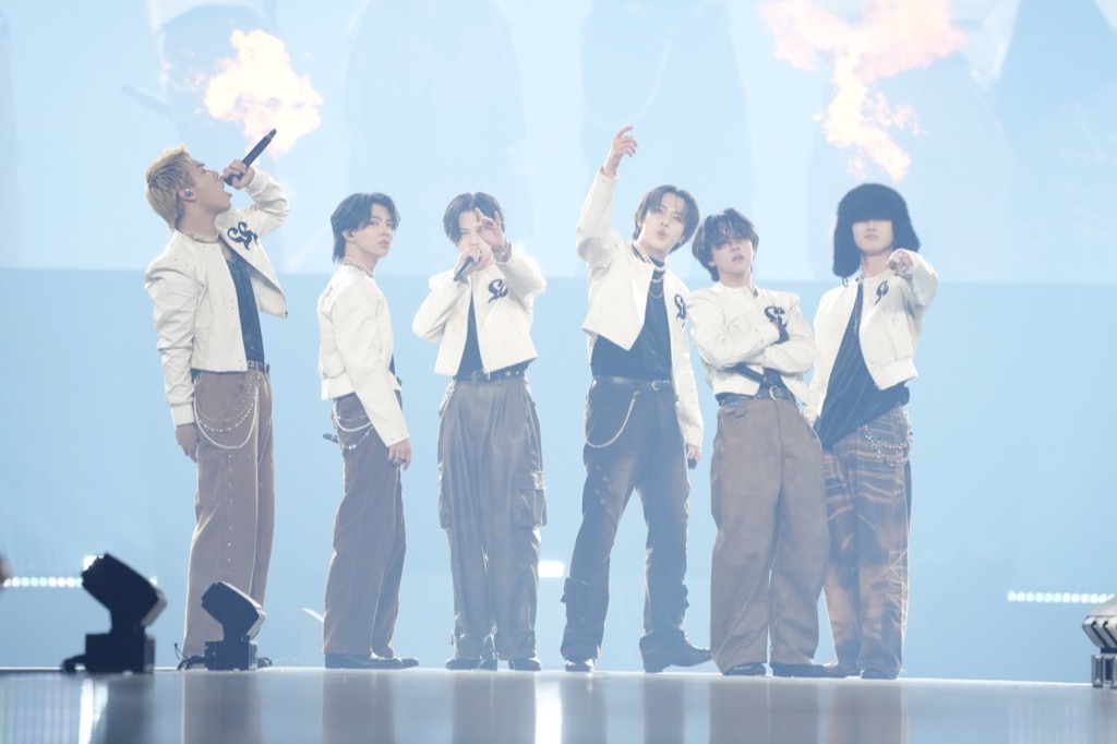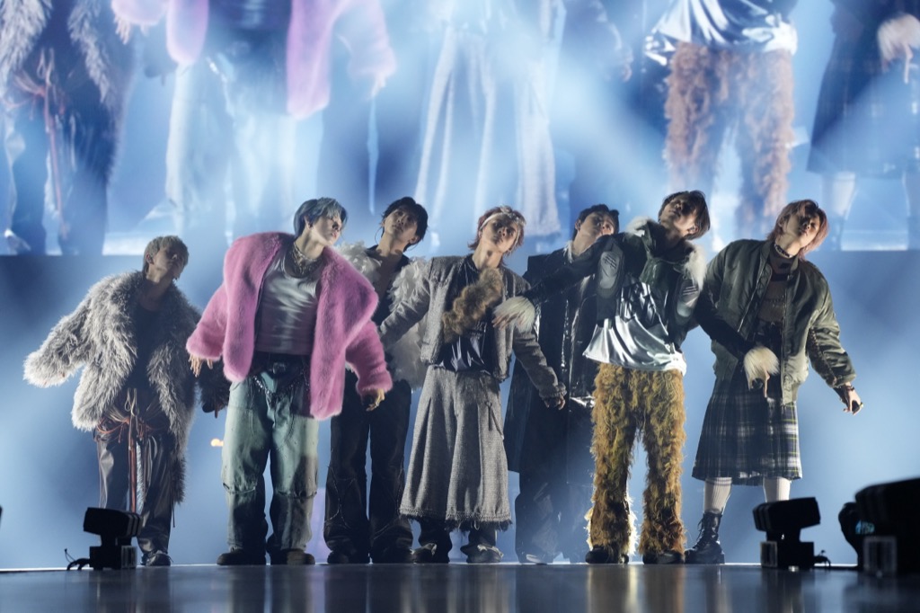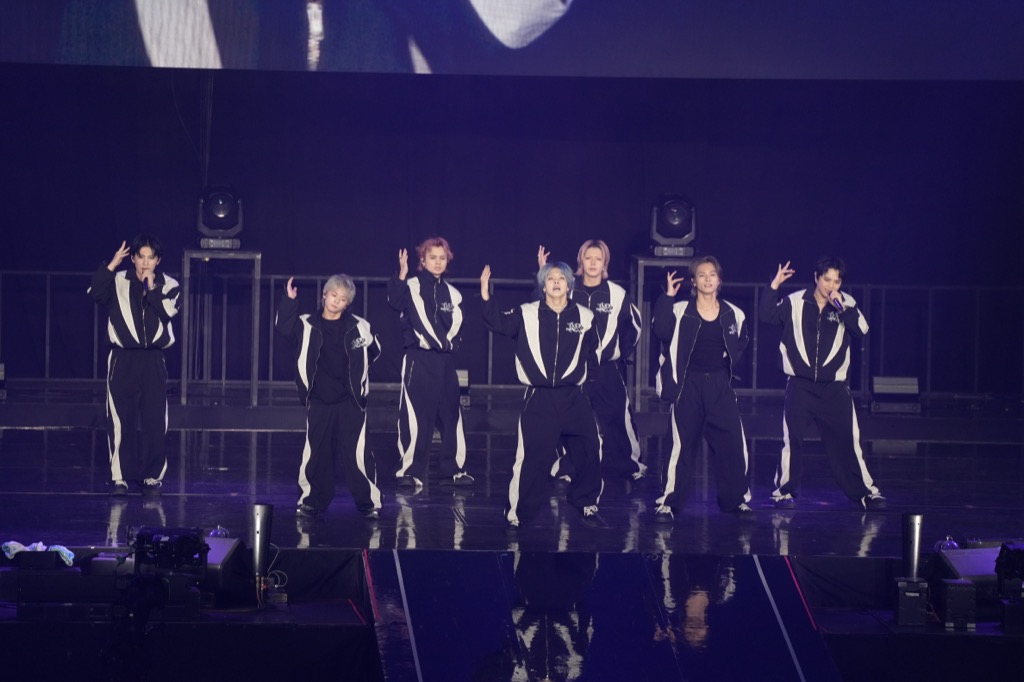 シルエット姿からラップで存在感を示したのはKID PHENOMENON。全員がマイクを持ち、ファーやレザージャケットなどゴージャスなジャケットに身を包んだ7人は「我こそが主役だ」とばかりに次々とセンターに立つ爆発力あるパフォーマンスを見せたかと思えば、カメラと花道をうまく使い、にぎやかな雰囲気を会場中に届けるなど、多彩なパフォーマンスで「Party Over There」「Cinderella」「Unstoppable」を届けた。