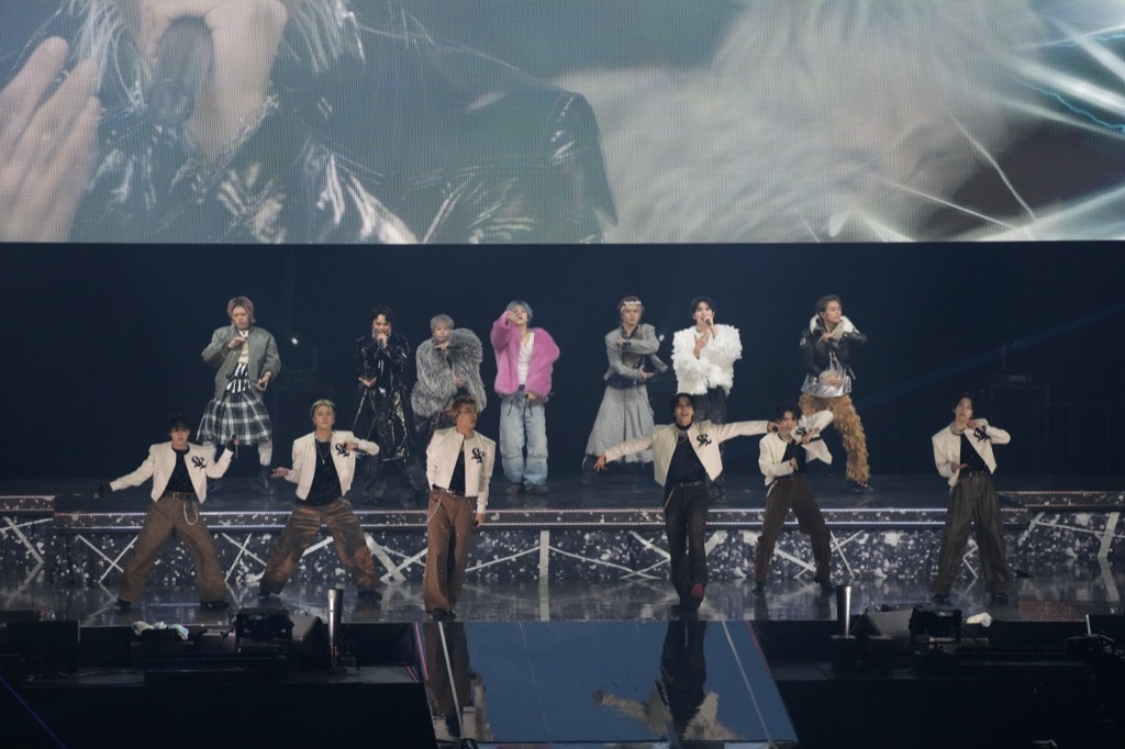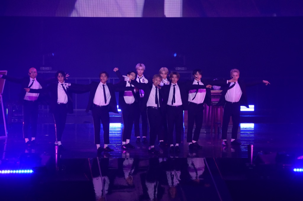 ここからはボーカル陣による珠玉のバラードが、ららアリーナを包みこむ。遠藤翼空と山本光汰(KID PHENOMENON)は、ステージの左右に立って「クロスロード」を。2人は少しずつ近づいていき、最後には向き合いながら、あふれそうな思いを切なく歌い上げた。花道に集まったWOLF HOWL HARMONYは4人でオーディション時の課題曲「LOVE RED」をアコースティックバージョンで歌唱。歌い終えると、4人は向かい合い、アカペラで美しいハーモニーを聴かせた。白いタキシード姿に着替えたYUHI、AERON、KOTA(THE JET BOY BANGERZ)は、今の季節にぴったりな最新曲「冬のダイアモンド」でしっとりと冬を彩る。メインステージに6人並んだLIL LEAGUEは、スタンドマイクで温かなラブソング「15分」を丁寧に歌いつないだ。