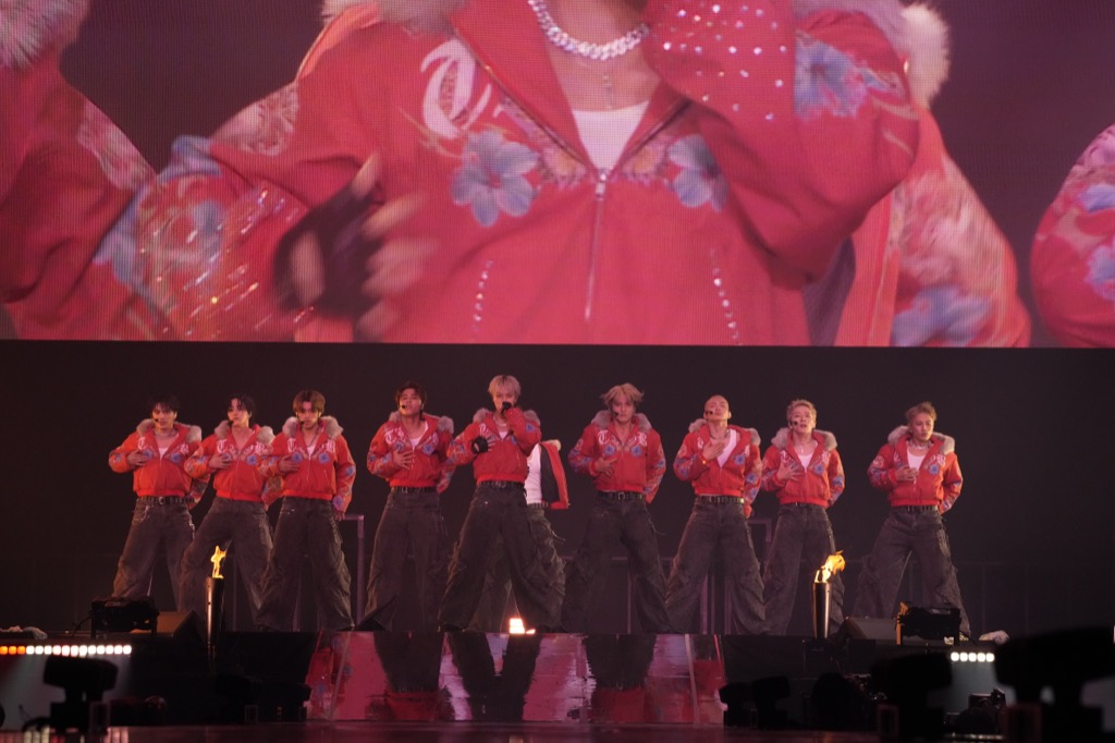 LIL LEAGUEを除く3組は、今年1stアルバムをリリースし、初の単独ツアーを開催した。これまでよりも一層、ライブを意識した楽曲作りや、魅せることに意識を向けた1年だったはず。ということで、ここからはそれぞれがしっかりと自分たちのステージを魅せるブロックへ。スクリーンに「shout TJBB」と映し出され、ストンプに乗せて大きな「TJBB!」コールが響き渡る。頼もしい観客の声に誘い出されたTHE JET BOY BANGERZメンバーは、赤いMA-1ジャケットに身を包み「TEN」「Attention」「BOYS -TJBB Anthem-」をアクロバットも取り入れダイナミックにパフォーマンス。スキルフルな歌とダンスは求心力を持ち、大人数ながら、会場中の視線を一点に集めていった。
