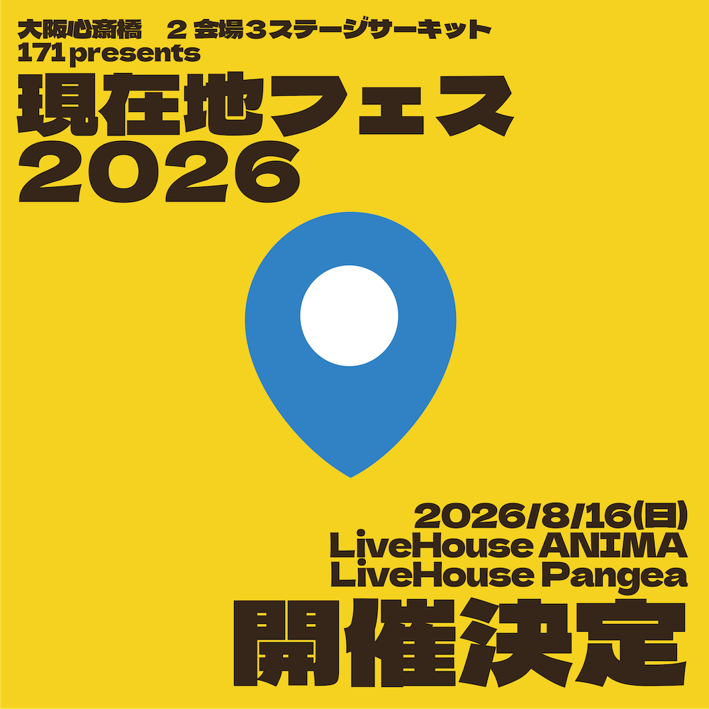 新年あけましておめでとうございます! 今年の8/16(日)に大阪心斎橋ANIMA/Pangeaにて171主催サーキット「現在地フェス2026」の開催が決定しました! 初開催となった昨年の現在地フェスでは、会場で皆さまの楽しそうな姿を見てとても誇らしい気持ちになりました。昨年と同様、171が「ライブハウスで見てほしい!」と思うアーティストを集めたイベントです! 詳細は後日解禁いたします。2026年のイナイチの現在地、ぜひ見に来てください!
