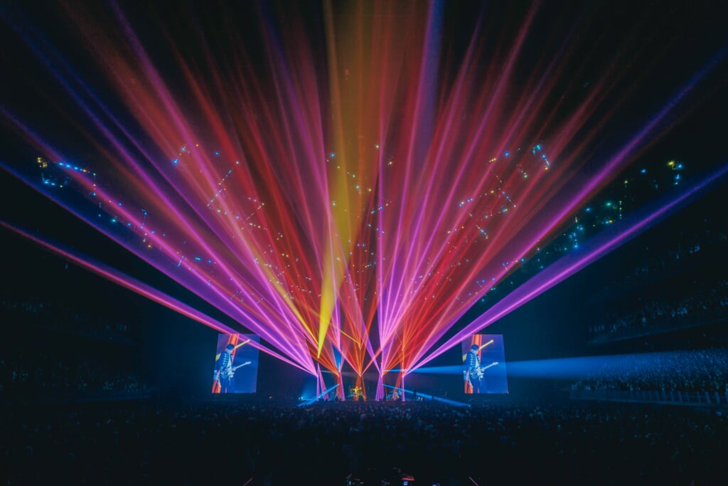 MC途中から唐突に割り込んできた「Before century」の電子音に間も無く新年を迎えることに気付かされた人も多いはず。お馴染みのコールアンドレスポンスの「FU-FU-」をたっぷり味わった後、会場そして配信で見た人と共にカウントダウンで迎えた2026年。新年1発目は今年の干支であり、ポルノの代名詞とも呼べる「ハネウマライダー」が披露され、会場で旋回するタオルが良い年になるために後押しする追い風のように一体感を生んだ。約10年ぶりの披露となる「スロウ・ザ・コイン」は、カウントダウン公演で聴きたいと期待していた人も多いはずであろう。しっかりと期待に応えてくれるポルノグラフィティが長年ファンに愛される理由がわかるとともに、続くライヴで初披露となる「極上ランディング」はいい意味で裏切られた方も多いのではないか。会場を埋めるラバッパーにとってカウントダウン公演だけの最高のサプライズになったはずだ。新年に相応しい3曲からたたみ掛けるように「Century Lovers」、「幸せについて本気出して考えてみた」と鉄板の盛り上げ曲へと展開し、本編ラストに披露されたのはライヴのテーマにもなっている「THE REVO」。