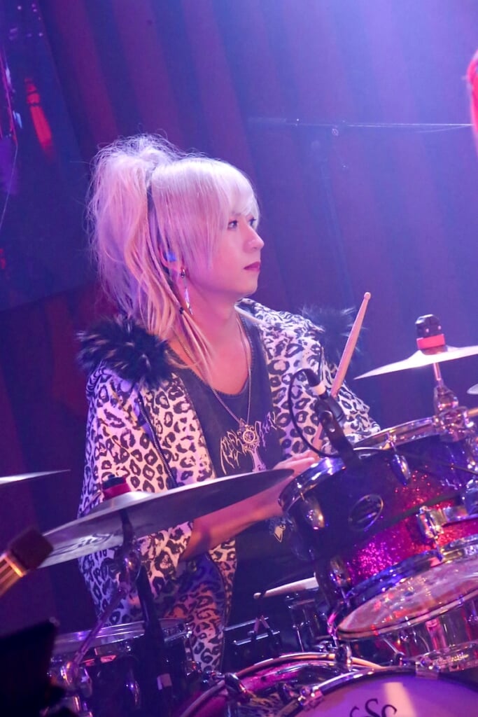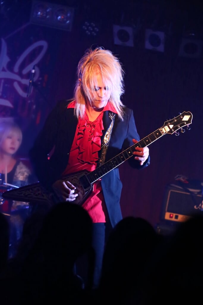 フロアの暗転と同時にミラーボールが回り出すと、温かい拍手に包まれ幕が開く。ギターのKENTARO(ex.Gargoyle)、ベースのDEN(test-No.)、ドラムの緩菜(DOG in ThePWO)と、豪華ゲストメンバーがステージに登場。最後にANGEL-TAKAが姿を見せると、フロアから大きな歓声が上がった。