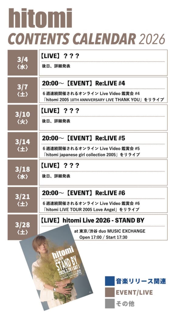 hitomiが、インスタグラムにコンテンツカレンダーを投稿し、2026年3月28日に東京・渋谷 duo MUSIC EXCHANGEで開催するワンマンライブ<hitomi Live 2026 – STAND BY>までの活動予定を発表した。
