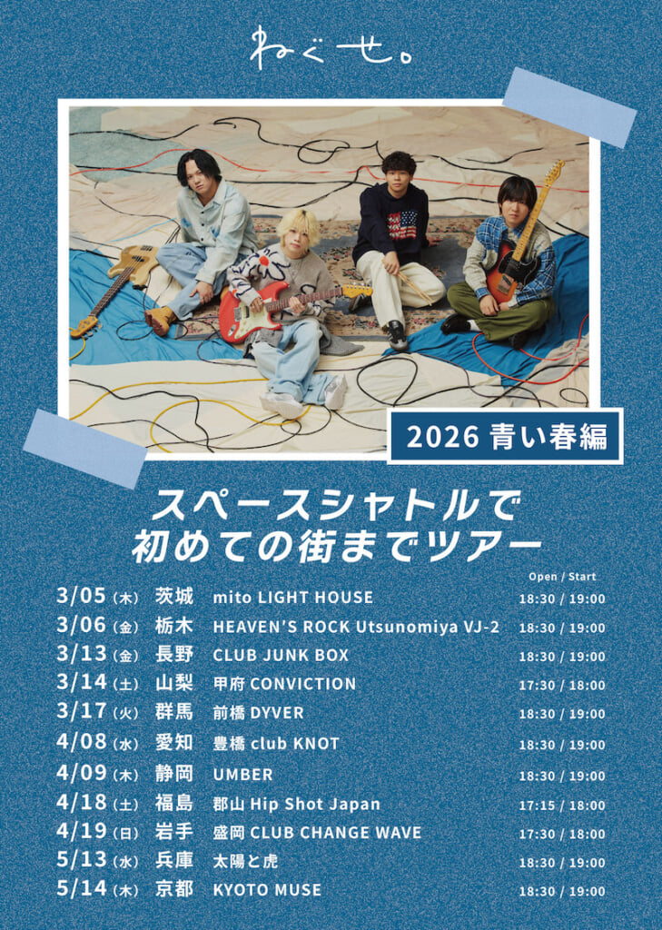 ねぐせ。が、3月よりワンマンツアー<スペースシャトルで初めての街までツアー 2026 青い春編>を開催することを発表した。